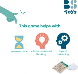 Obsah balení: 24 dřevěných tyček s barevnými konci (21 × 0,9 cm), 30 karet s úkoly a látkový sáček pro snadné ukládání. Hra podporuje vytrvalost, myšlení zaměřené na řešení a logické uvažování.