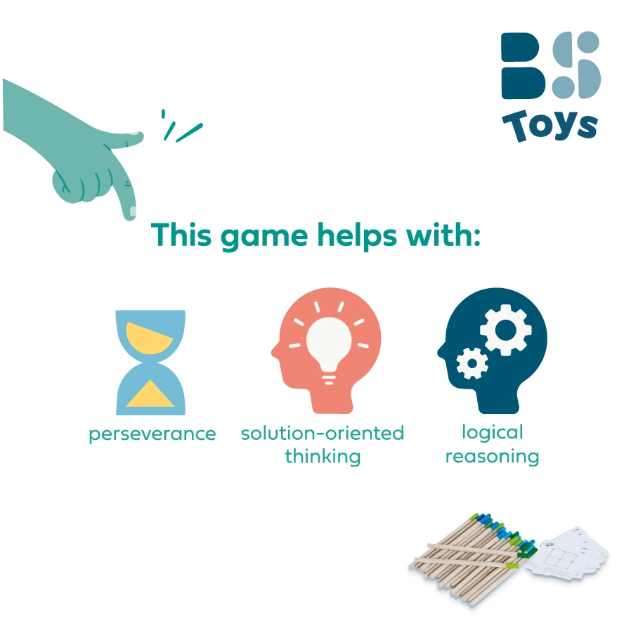 Tato logická hra s dřevěnými tyčkami přináší chytrou a trpělivost rozvíjející zábavu pro celou rodinu. Vyberte si zadání z karty, poskládejte z tyček požadovaný tvar a na zadní straně karty si zkontrolujte řešení. Díky postupně rostoucí obtížnosti se k úkolům rádi vrátíte znovu a znovu.