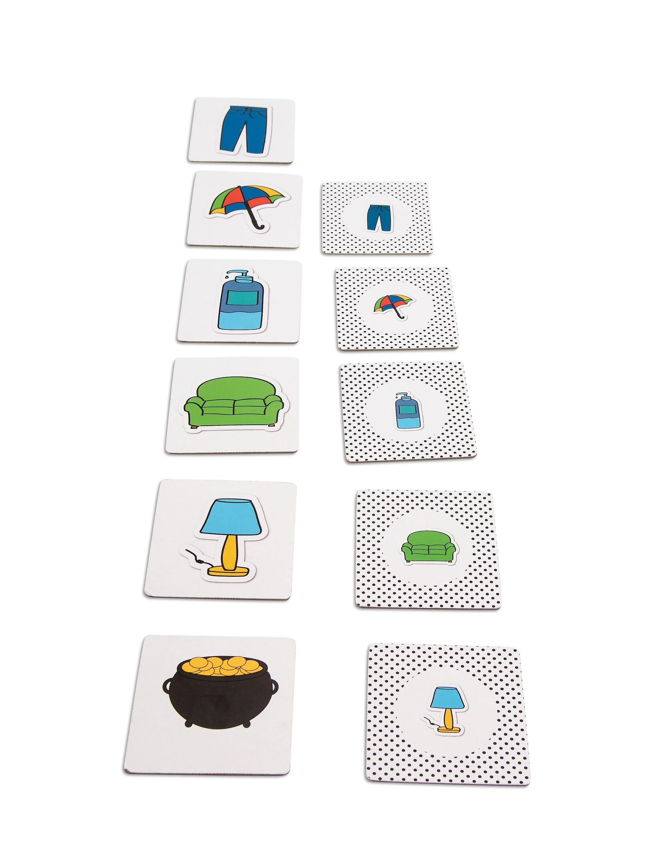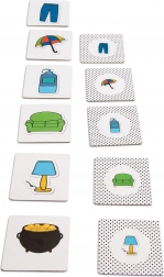 Rodiče mohou snadno připravit rozložení karet a schovat obálky; děti pak sledují stopy, porovnávají obrázky a postupují za cílem – zlatým pokladem. Silné kartonové dílky s jasnými ilustracemi podporují vizuální orientaci, barvy a tvary.