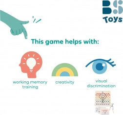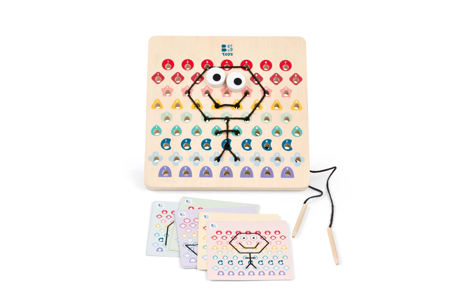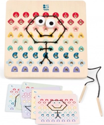 Objevte zábavnou didaktickou sadu pro malé tvůrce: dřevěná perforovaná deska, šňůrky a karty s předlohami, díky nimž děti vytvářejí krásné motivy podle barevných kódů. Hra rozvíjí jemnou motoriku, logické myšlení, vizuální představivost a kreativitu – od jednoduchých úkolů až po náročnější kódování vzorů.