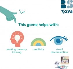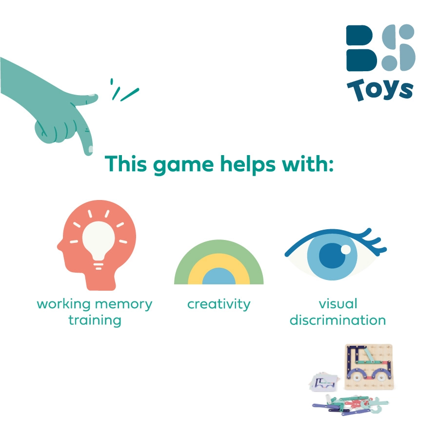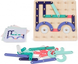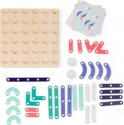Součástí je pevná dřevěná základna a sady předloh, které postupně zvyšují obtížnost. Hra je ideální pro domácí zábavu i předškolní rozvojové aktivity – děti se hravou formou učí pracovat s tvary, barvami a prostorem.