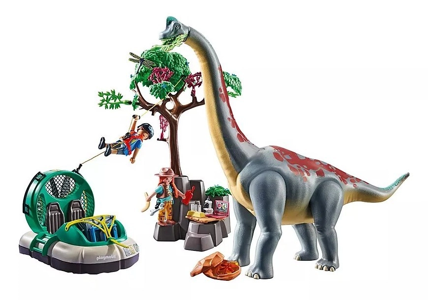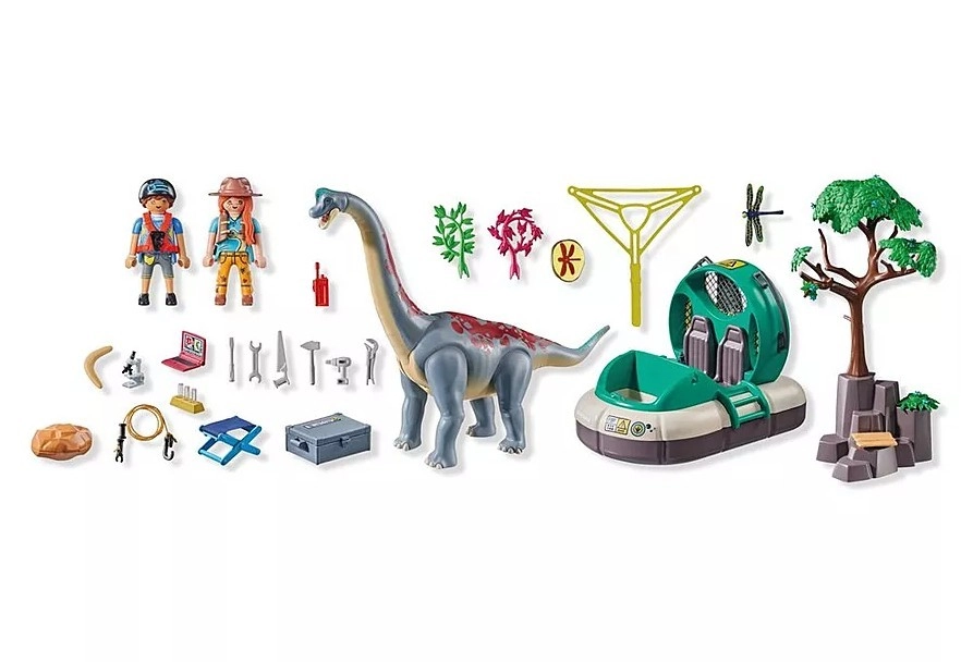Brachiosaurus má pohyblivou čelist a realistické detaily, strom nabízí odnímatelné listy pro interaktivní krmení. V sadě najdete i „ukryté poklady“, například vážku uvězněnou v jantaru, nástroje, lana, sítě a výzkumné vybavení včetně notebooku pro dokumentaci chování.