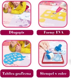 Díky velké ploše 98 × 78 cm se na podložce pohodlně vyřádí jedno či více dětí. Podložku snadno složíte, což oceníte doma i na cestách. Součástí balení jsou také šablony, razítka a barevné formičky, které rozšiřují možnosti tvoření a podněcují rozpoznávání barev a tvarů.