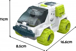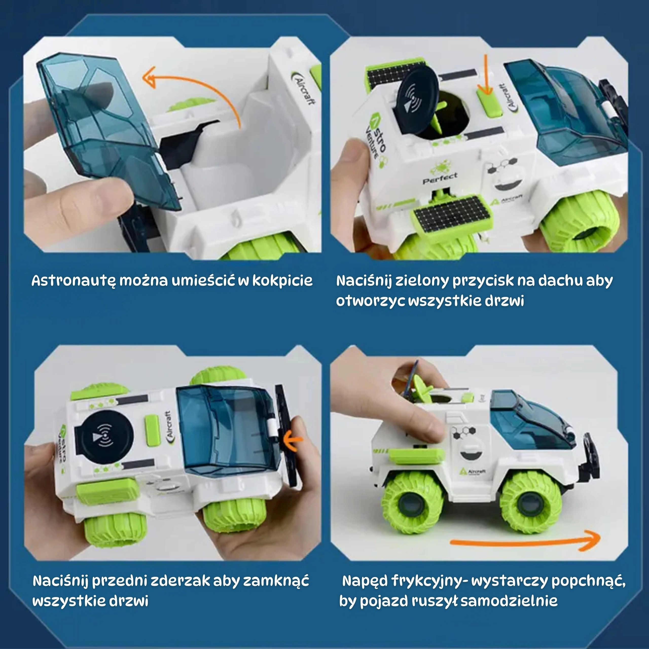 Tento futuristický vesmírný rover zaujme bílou karoserií s kontrastními zelenými prvky a realistickými detaily inspirovanými průzkumnými vozidly. Průhledná, otevírací kabina umožní pohodlně usadit astronauta za řízení, zatímco interaktivní radar se po stisku tlačítka na střeše automaticky vysune a po stisku předního nárazníku se zase ukryje.