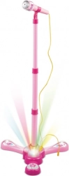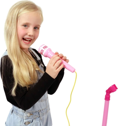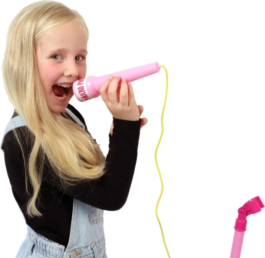 Růžový karaoke mikrofon na stojanu promění každý dětský pokoj v pódium. Nabízí 12 vestavěných písní, barevné světelné efekty a možnost připojení MP3 nebo mobilu. Díky nastavitelné výšce 40–80 cm roste s dítětem a je ideální pro malé zpěváky od 3 let.