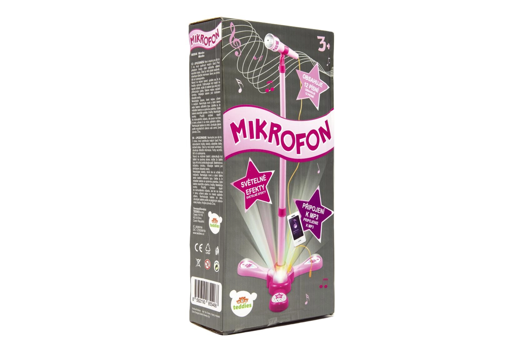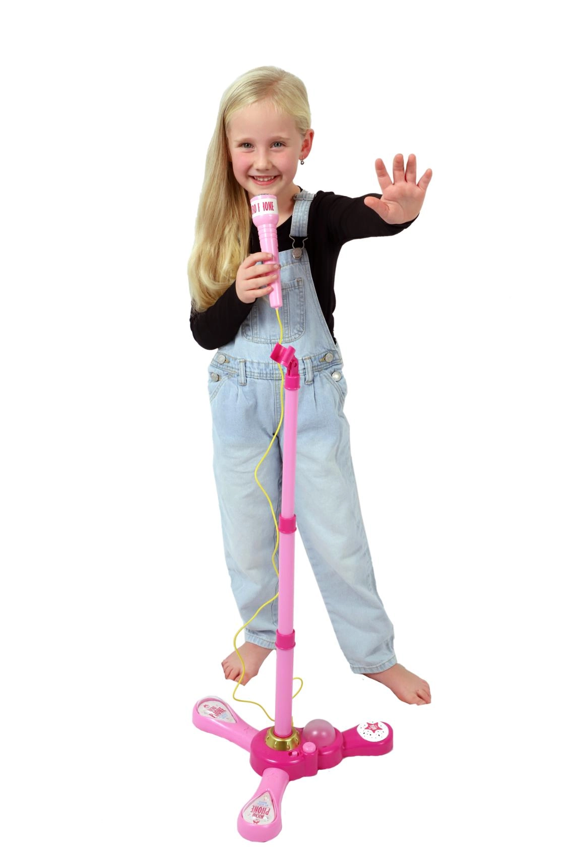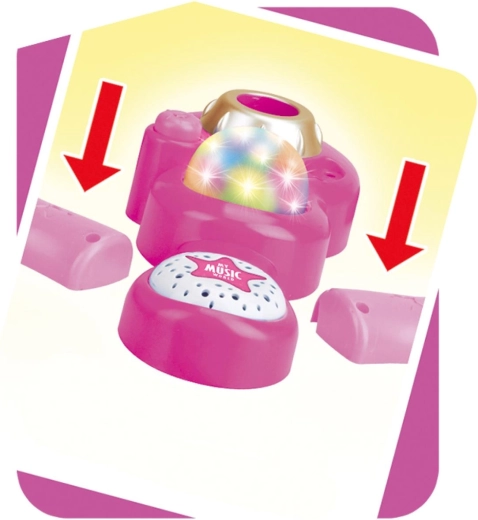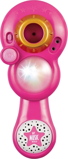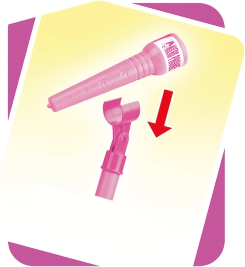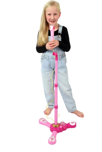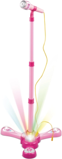 Uspořádejte doma nezapomenutelnou karaoke show. Tento růžový mikrofon se stabilním tripodovým stojanem má poutavé světelné efekty a přehraje 12 předem nahraných písní. Snadno k němu připojíte MP3 přehrávač nebo mobilní telefon a pustíte oblíbené hity.