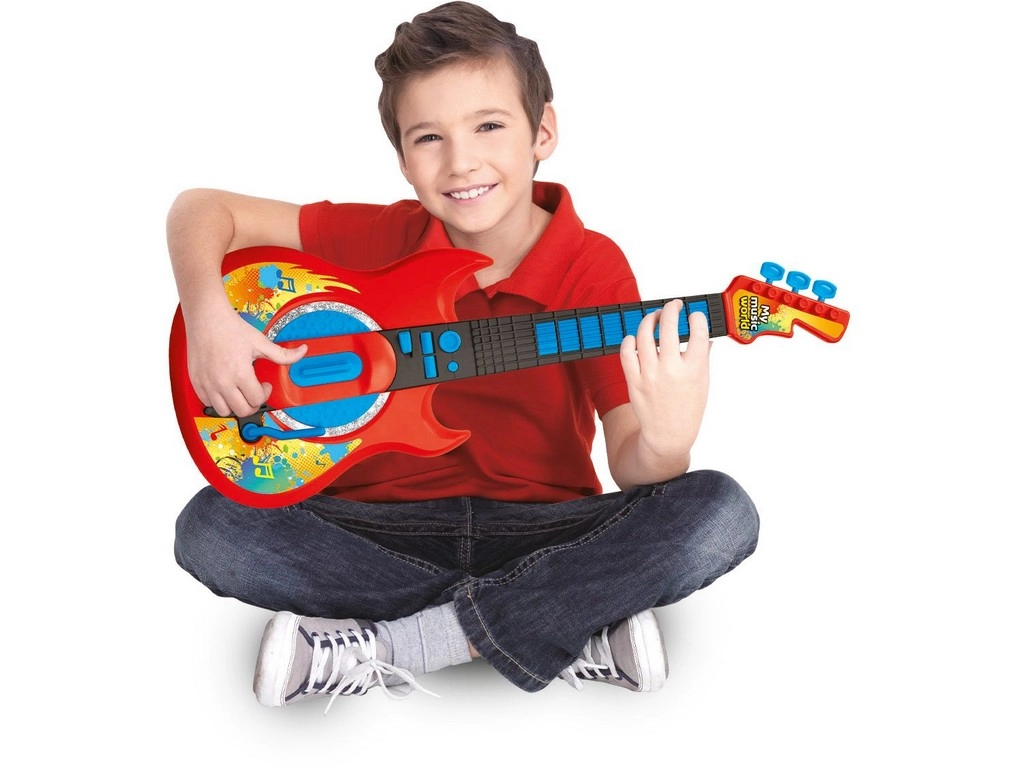 Stylová dětská elektrická kytara v moderním červeném designu potěší malé hudebníky od 3 let. Podporuje rozvoj motoriky, hudebního sluchu a smyslu pro rytmus. Nabízí dva hrací režimy, demo melodie, efektovou páku, imitaci úderu na struny a ovládání hlasitosti.