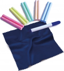 Součástí je krabička s 10 křídami, 1 stíratelná černá fixa a mazací hadřík – můžete začít kreslit hned po vybalení.