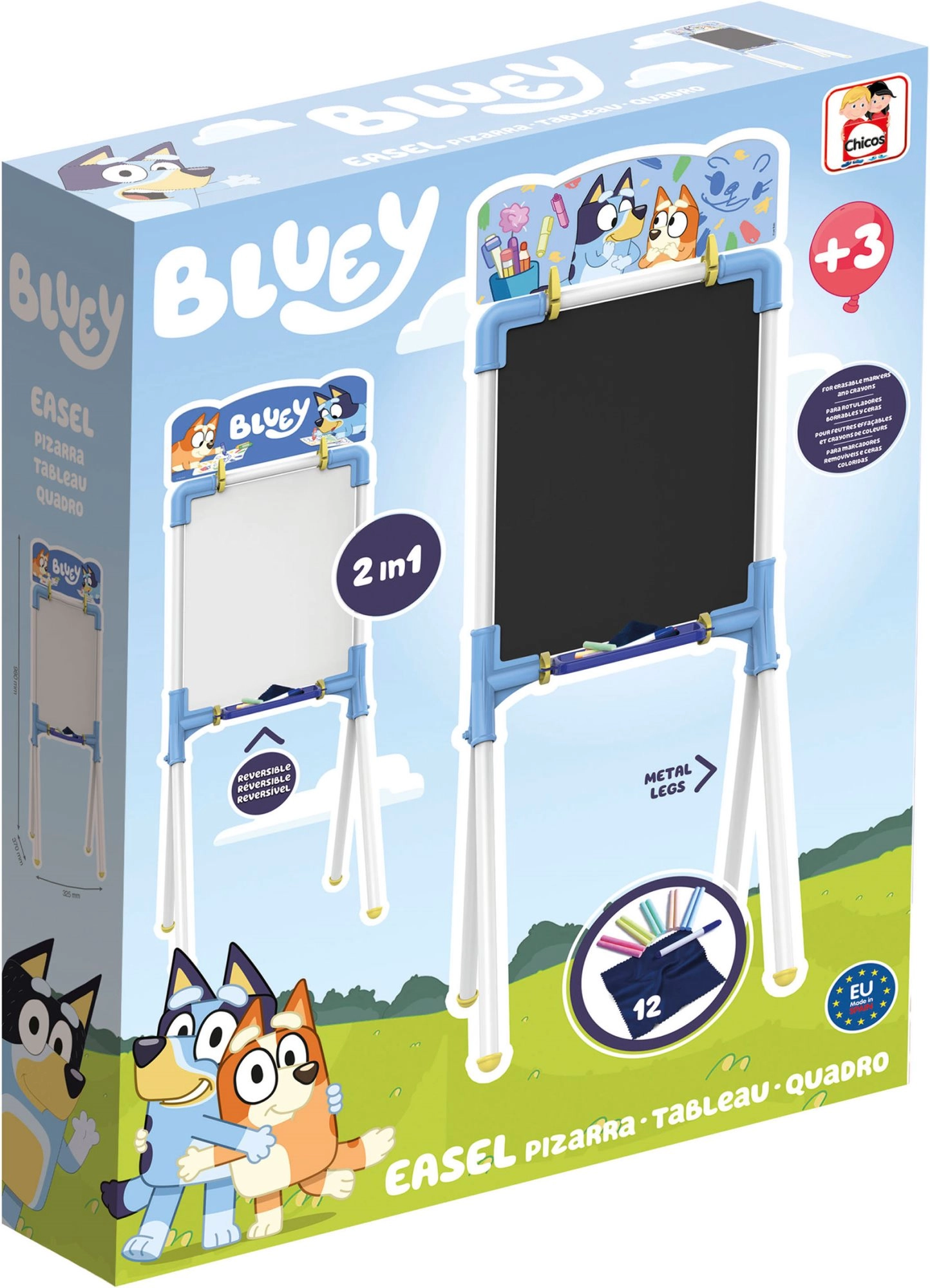 Objevte zábavnou a praktickou pomůcku pro malé umělce – oboustrannou tabuli BLUEY 2v1. Jedna strana je bílá stíratelná pro fix, druhá klasická černá na křídy. Díky stabilní konstrukci, odkládací poličce a bohatému příslušenství je ideální pro kreslení, psaní i učení.