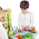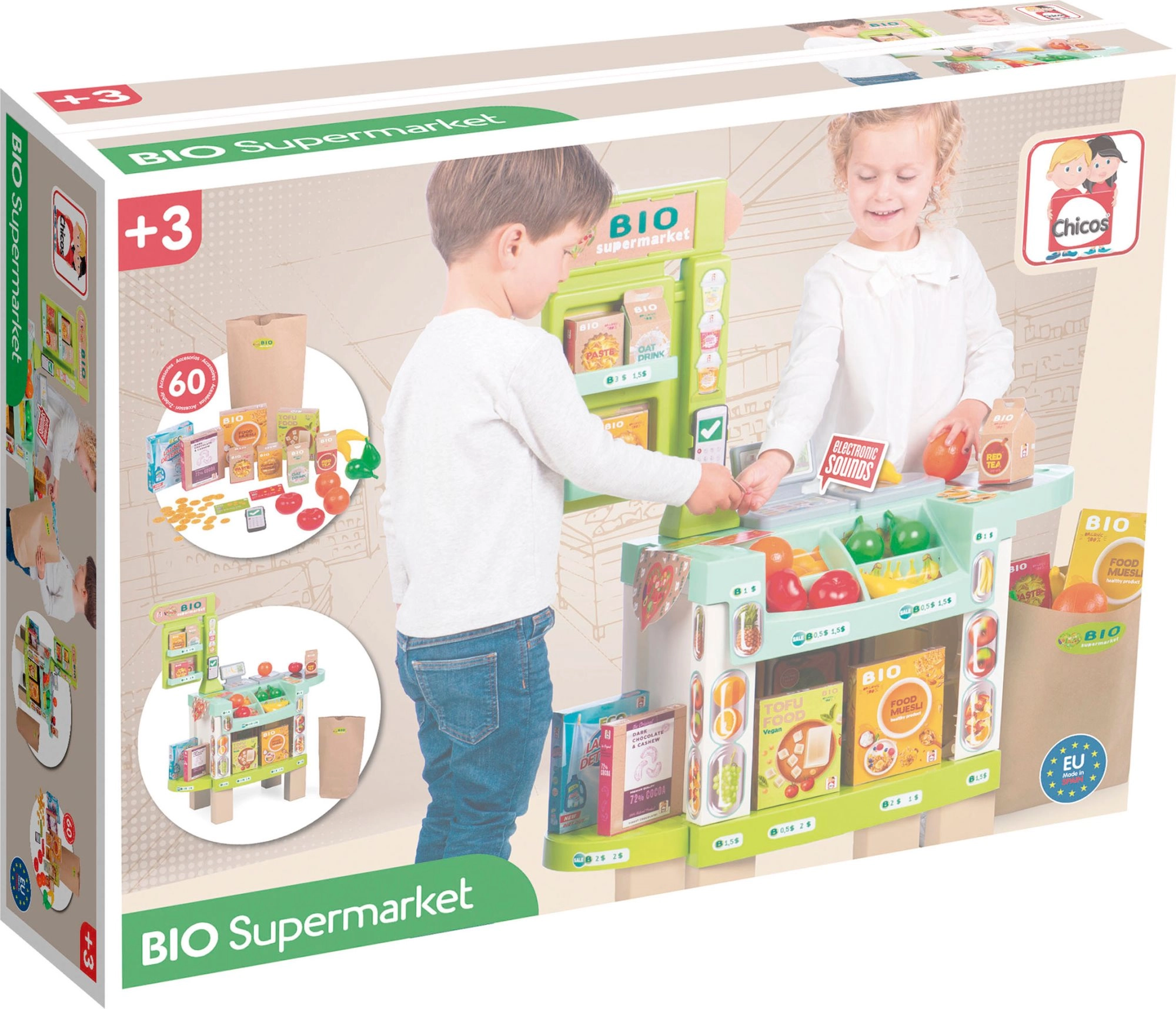 Dětský supermarket BIO CHICOS promění pokoj v malou prodejnu, kde si děti vyzkouší role prodavače i zákazníka. Bohatá sada 60 doplňků včetně ovoce, krabiček s potravinami, skeneru a platebního terminálu podporuje role-play a rozvoj komunikace, jemné motoriky a logického myšlení.