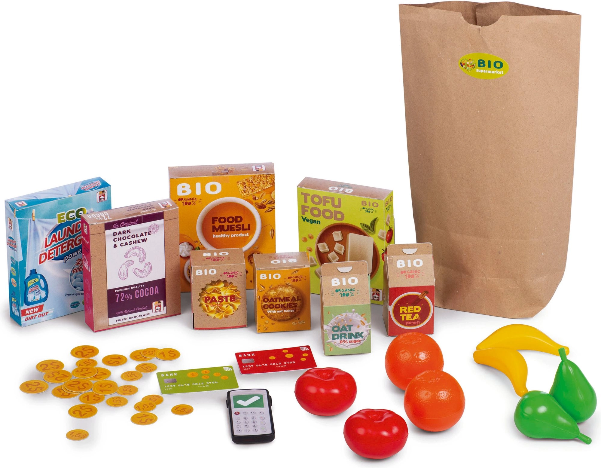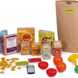 Ovoce, krabičky s potravinami, mince, telefon i velká BIO nákupní taška – vše pro kompletní hru na nakupování.