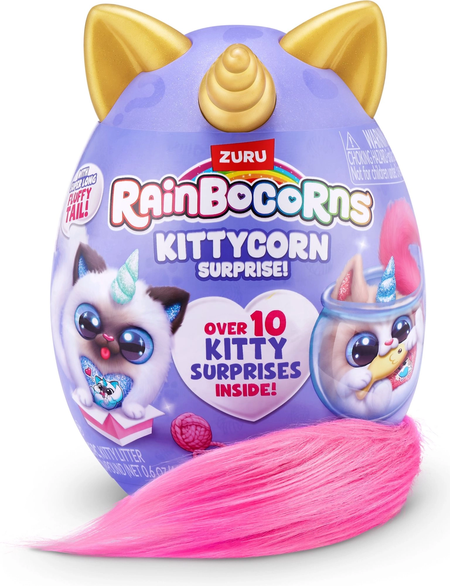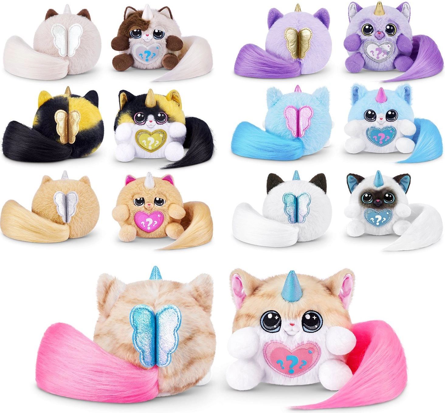 Další série oblíbených RAINBOCORNS přináší roztomilé Kittycorn kočičky s extra měkkými a dlouhými ocásky. Každá plyšová kočička má na hrudi třpytivé srdce, které po setření odhalí, co vaše koťátko miluje. Uvnitř najdete také miniaturního Boo‑Boocorna v malém vajíčku, samolepky a další doplňky pro kreativní hraní.