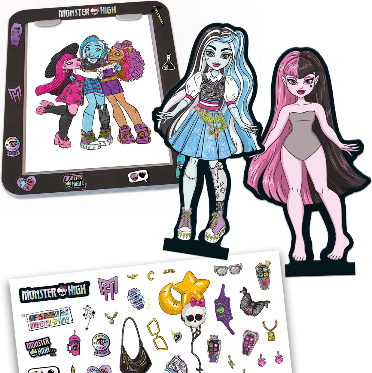 - 4 figurky MONSTER HIGH, 1 svítící podložka (tablet), 4 podstavce na figurky, 1 tužka, 1 arch samolepek, 32stránková brožura s obkreslovacím obsahem, 1 scéna, návod