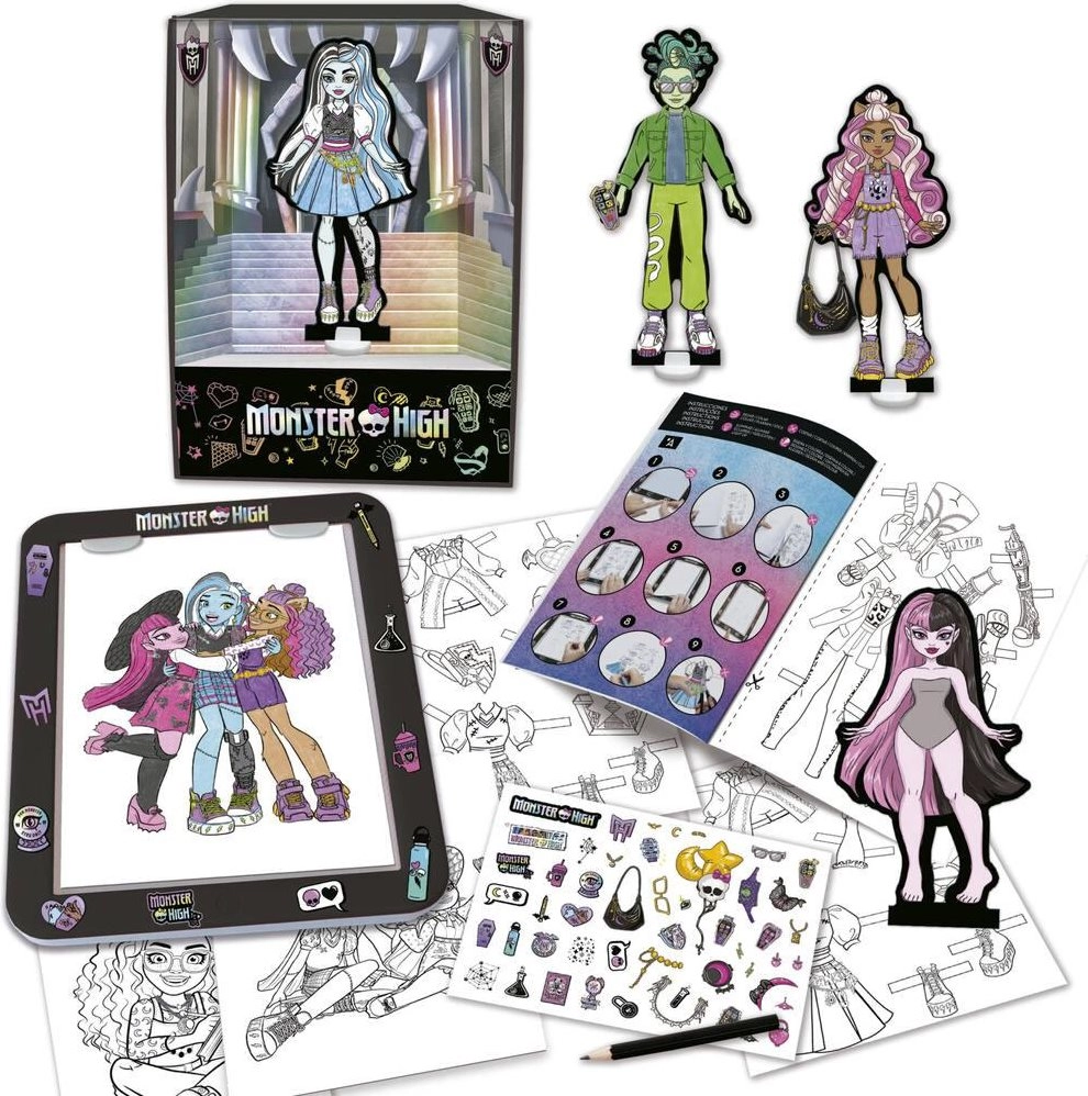 Objevte zábavnou kreativní sadu, se kterou děti navrhnou vlastní módní outfity pro figurky MONSTER HIGH díky tabletové podložce s podsvícením. Sada rozvíjí fantazii a kreativitu, podporuje jemnou motoriku a trénuje soustředění a trpělivost. Součástí je vše potřebné k navrhování, obkreslování, vybarvování a zdobení – a krabici lze proměnit v přehlídkové molo pro finální módní show.