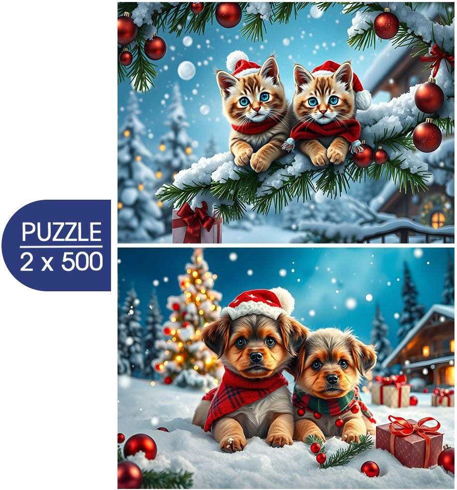 Užijte si sváteční zábavu s roztomilými motivy – sada obsahuje dva kvalitní puzzle o 500 dílcích s motivy vánočních koťátek a štěňátek. Ideální pro klidné chvíle doma, rozvoj trpělivosti a společné skládání. Po složení má každý obrázek rozměr cca 47,8 × 34,2 cm.