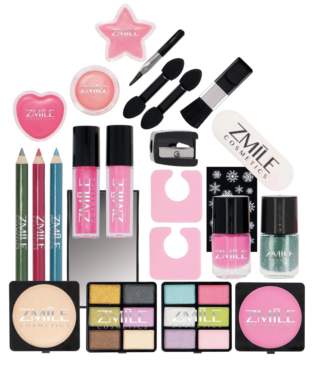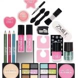 - lesky na rty, tvářenka, oční stíny, konturovací tužky na oči a rty, ořezávátko, separátor na nehty, pilník, aplikátory očních stínů, štěteček, laky na nehty, samolepky na nehty