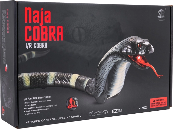 RC had COBRA je efektní hračka, která zaujme realistickým vzhledem i pohybem. Segmentovaný ocas (21 dílů) zajišťuje plynulé "vlnění" a rychlé manévry, zatímco pohyblivý jazyk a LED světlo v tlamě dodávají hře dramatický nádech. Ovládání na frekvenci 2,4 GHz je stabilní a snadno zvládnutelné i pro děti.