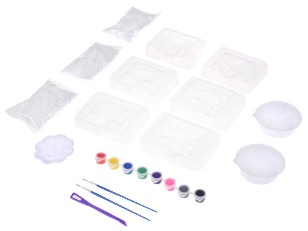 - 3 sáčky sádry, průhledné formy na ptáky, 2 odměrky, paleta na míchání, 8 akrylových barev, 2 štětce, plastový nástroj/nožík