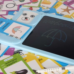 Učení je přehledné a motivující: 112 oboustranných karet (224 obrázků) pokrývá témata jako Zvířata, Pojazdy, Předměty, Jídlo, Zelenina, Ovoce, Rodina, Barvy, Tvary, Povolání, Oblečení a Příroda. Praktické ovládání nabídne funkce opakování, regulace hlasitosti, mazání a zámek mazání. Lehká konstrukce a USB nabíjení zaručí pohodlné použití kdekoli.