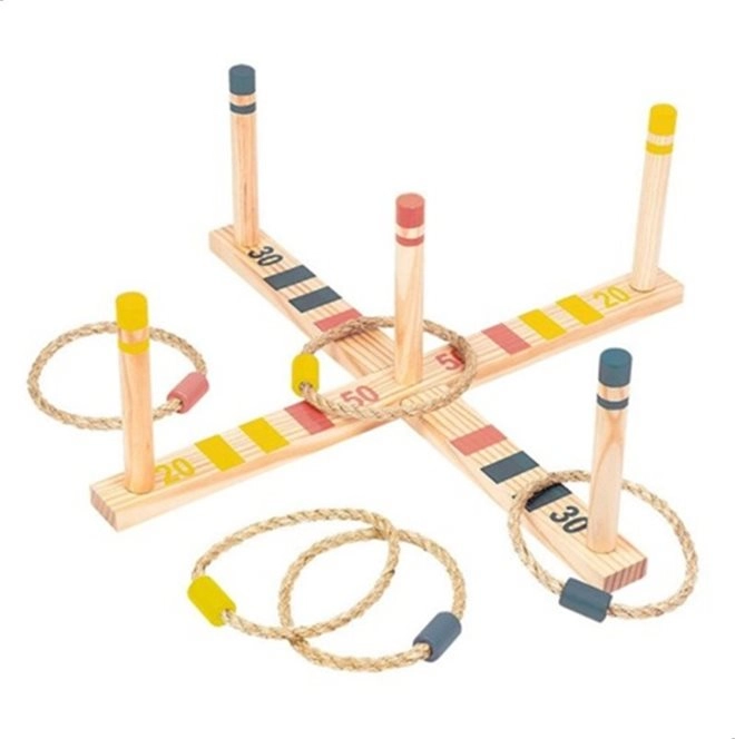 - Dřevěný kříž s 5 kolíky, 5 házecích kroužků, návod