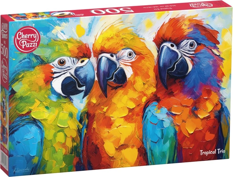 Užijte si relax s kvalitním puzzle Cherry Pazzi. Motiv Tropické trio nabízí živé barvy a přenese vás do exotické přírody. Díky 500 dílkům a rozměru po složení 50 × 34,5 cm je ideální pro klidný večer i trénink soustředění.