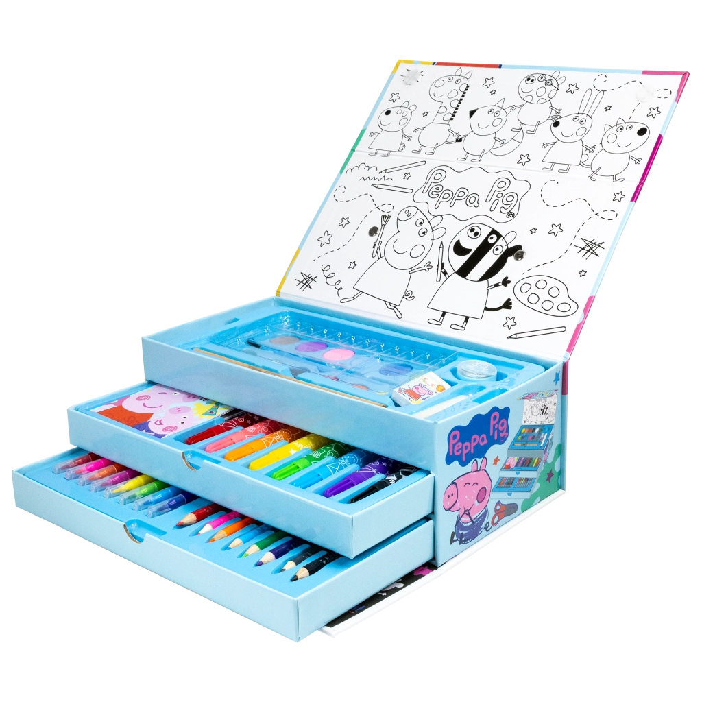 Objevte kreativní box Peppa Pig plný výtvarných potřeb pro malé umělce. Praktický třípatrový box nabízí vše, co děti potřebují k tvoření – od vodovek a palety po fixy, pastelky a pera. Skvělá volba pro domácí tvoření, školu i dárky.