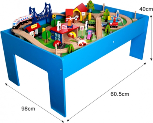 Tato mega dřevěná vláčkodráha na stolku je promyšlené herní řešení, které udrží trať i doplňky přehledně na jednom místě. Robustní dřevěný stůl se zvýšenými okraji a potiskem silnic na desce podporuje kreativní hru a rozvoj jemné motoriky. Set je vyroben v živých, atraktivních barvách, má oblé tvary bez ostrých hran a lze jej dále rozšiřovat o další prvky.