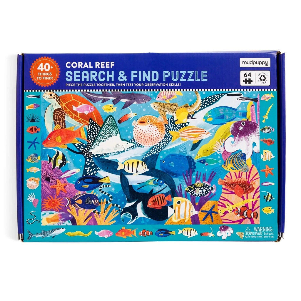 Objevte kouzlo podmořského světa s puzzle Mudpuppy Korálový útes. Po složení 64 dílků děti i dospělí procvičí pozornost a jemnou motoriku, protože budou hledat více než 40 mořských tvorů kolem obrázku. Puzzle je vyrobeno z FSC certifikovaného, recyklovaného kartonu a dodává se v pevné, dárkové krabičce.