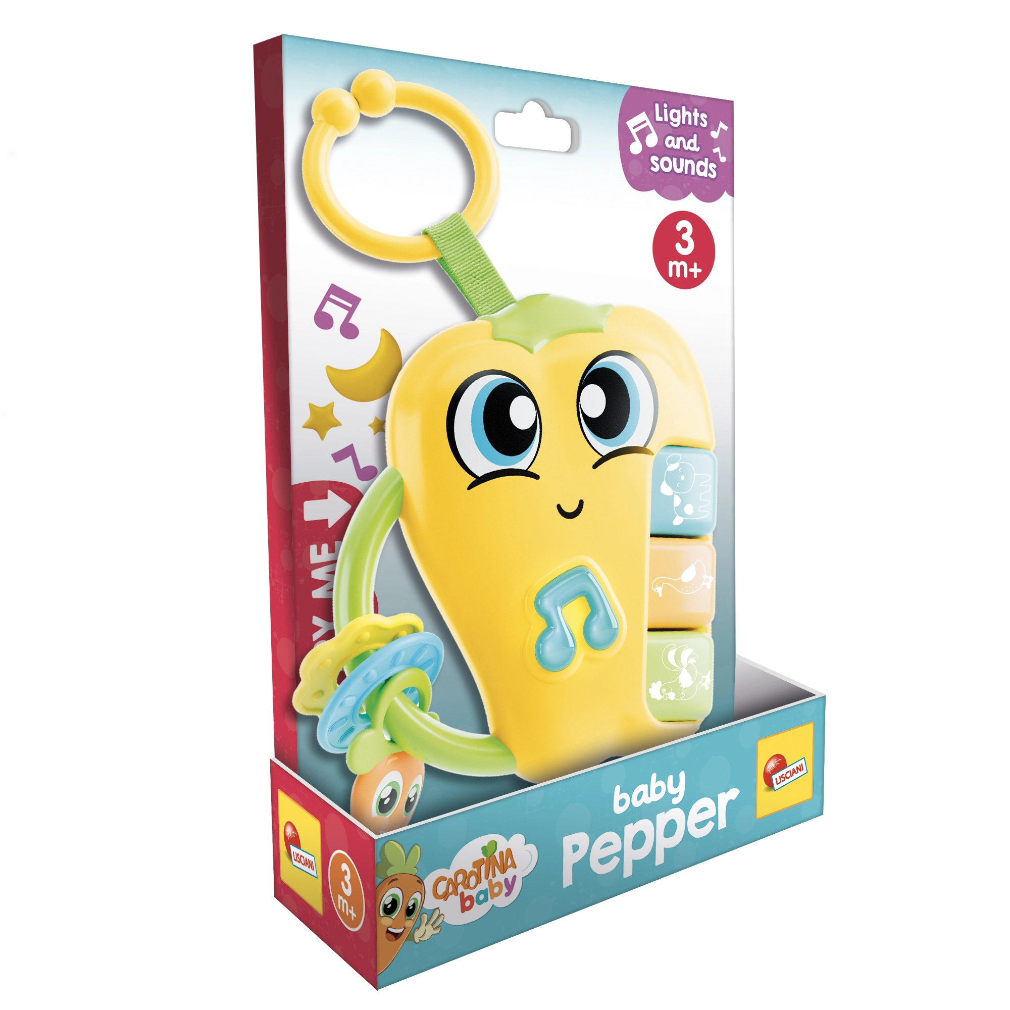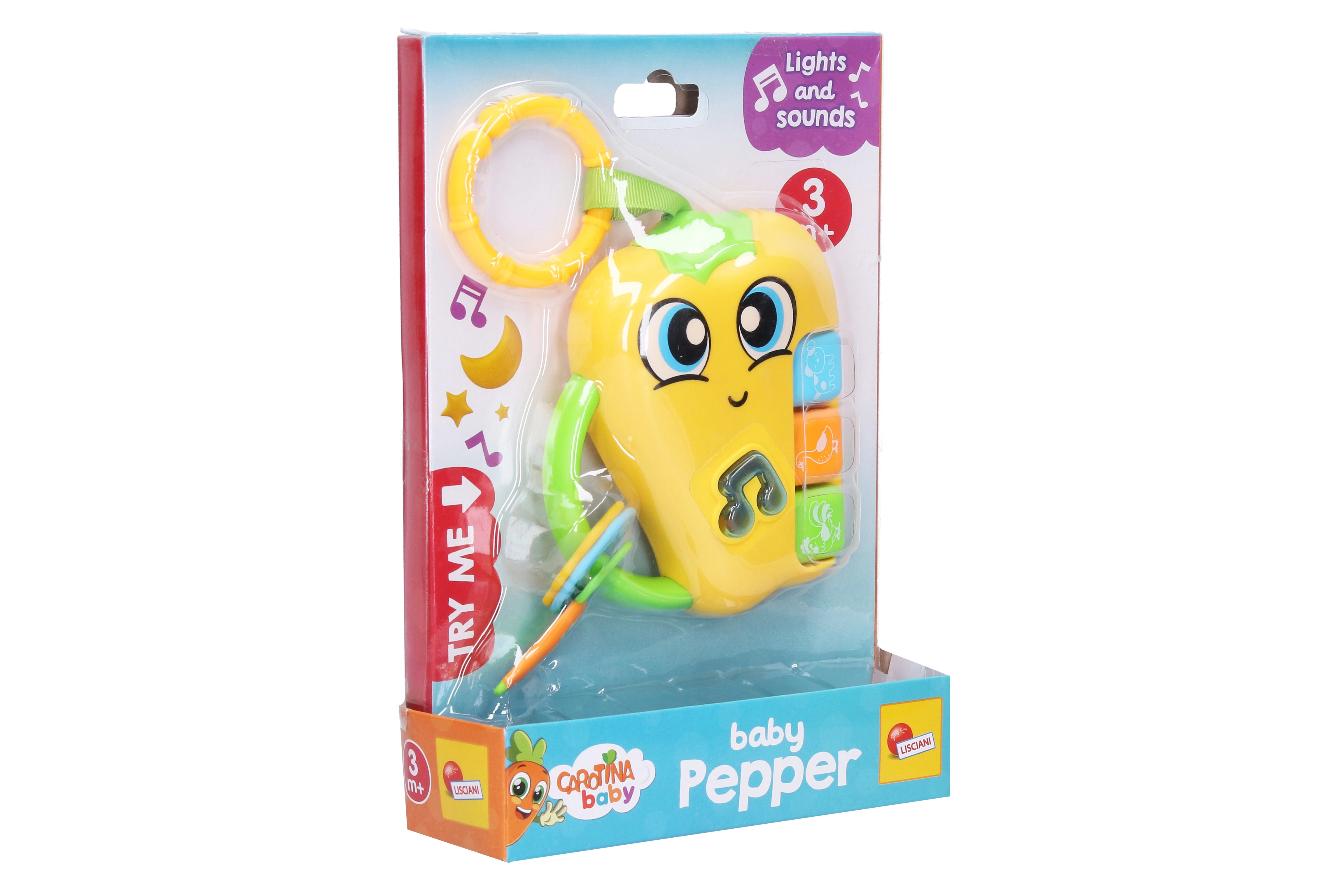 Zábavná hračka pro nejmenší Carotina paprička s efekty nabízí světelné a zvukové podněty, které podporují smyslový rozvoj. Děti zaujmou 3 tlačítka se zvířátky s melodiemi a zvuky, tlačítko s notou se 2 melodiemi a blikáním a praktický kroužek na zavěšení. Baterie jsou součástí balení, takže zábava může začít hned.