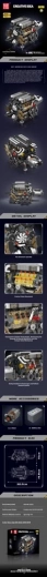 - Realistické funkce: ventilový rozvod, pohyblivé písty, kliková hřídel, dvojité turbodmychadlo, výfukové potrubí