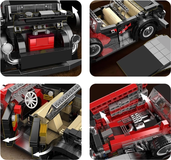 Tento detailní model historického vozu v elegantní černo‑červené kombinaci potěší každého milovníka klasických aut i stavebnic. Robustní konstrukce, věrná silueta a promyšlené prvky interiéru i exteriéru zaručují atraktivní stavbu i působivý výstavní kousek.