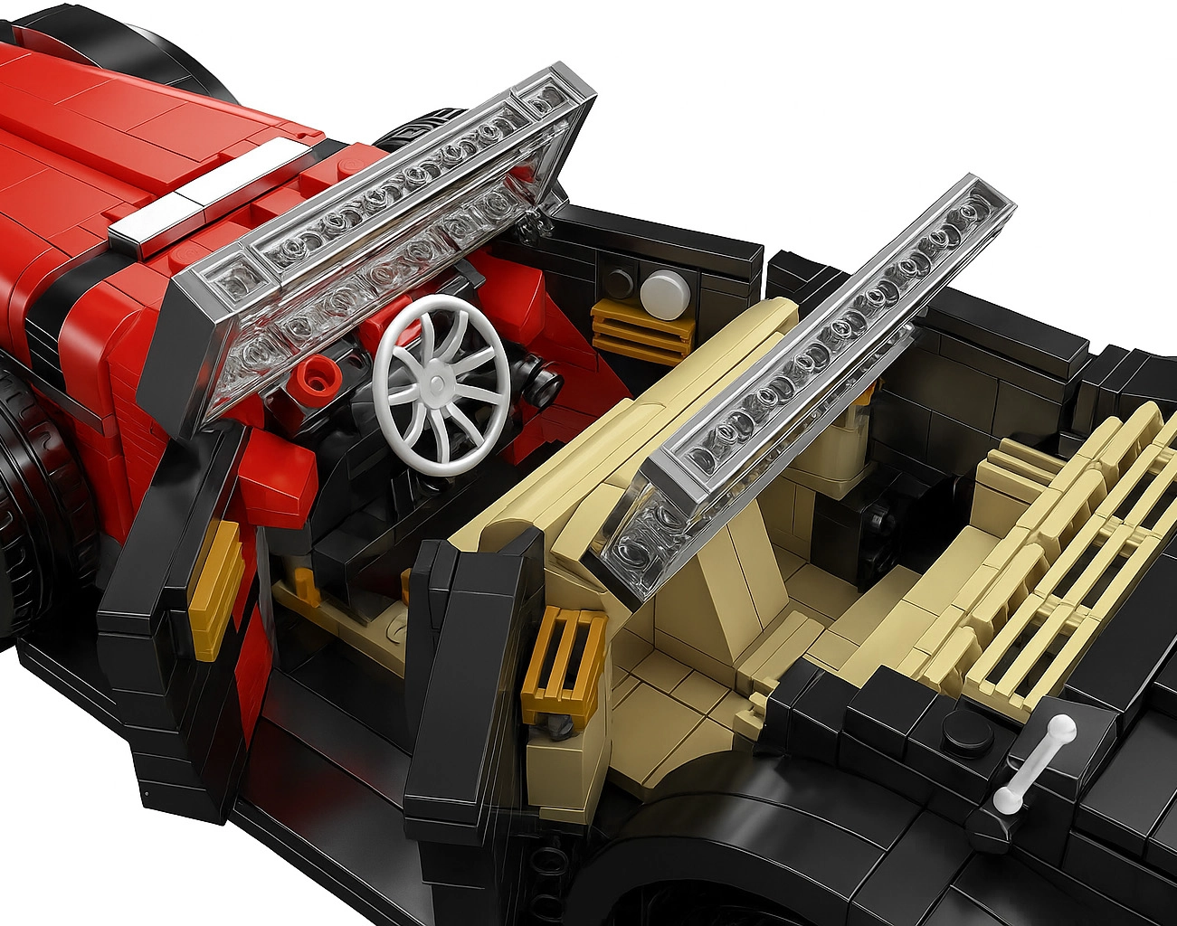 Díky odnímatelné střeše snadno proměníte kupé v kabriolet, otevírací dveře a kapota motoru odhalí další realistické detaily. Gumové pneumatiky, výrazné blatníky a světla podtrhují autentický vzhled. Stavebnice je vhodná pro starší děti a dospělé, kteří ocení spojení zábavy ze stavění a dekorativní hodnoty hotového modelu.