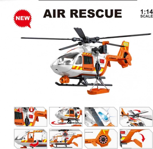 Děti ocení otevírací boční dveře a zadní klapku, pohyblivý hák s transportním košem a skládací i otáčející se rotory. LED osvětlení vpředu, nahoře i v kokpitu spolu s autentickými zvuky letu a alarmu umocní atmosféru záchranných akcí. Vrtulník je napájen 2× AAA bateriemi (v balení).