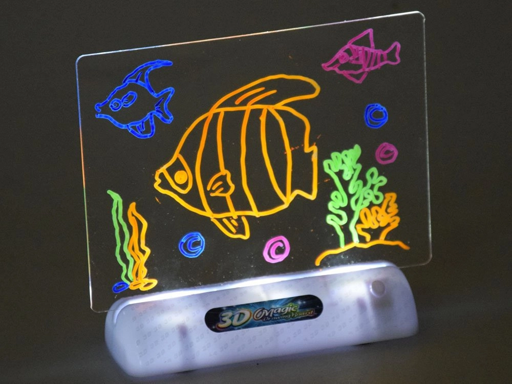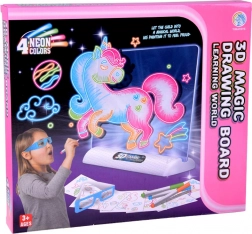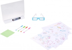 Tato kouzelná 3D kreslící tabule promění každý nápad v zářivý obraz. Děti mohou kreslit volně, nebo obkreslovat z přiložených šablon – po nasazení 3D brýlí obrázky „ožijí“ a získají úchvatný prostorový efekt. LED podsvícení zvýrazní neonové barvy a promění výtvor i v originální noční lampičku.
