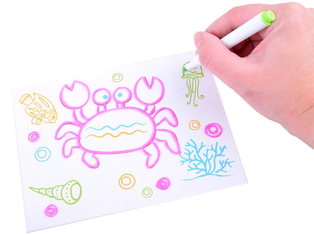 Součástí balení jsou 4 fluorescenční fixy, oboustranné šablony s motivy moře, 3D brýle a čisticí hadřík. Hladký povrch tabule se snadno čistí, takže je ideální pro opakované použití a každodenní tvoření bez nepořádku.
