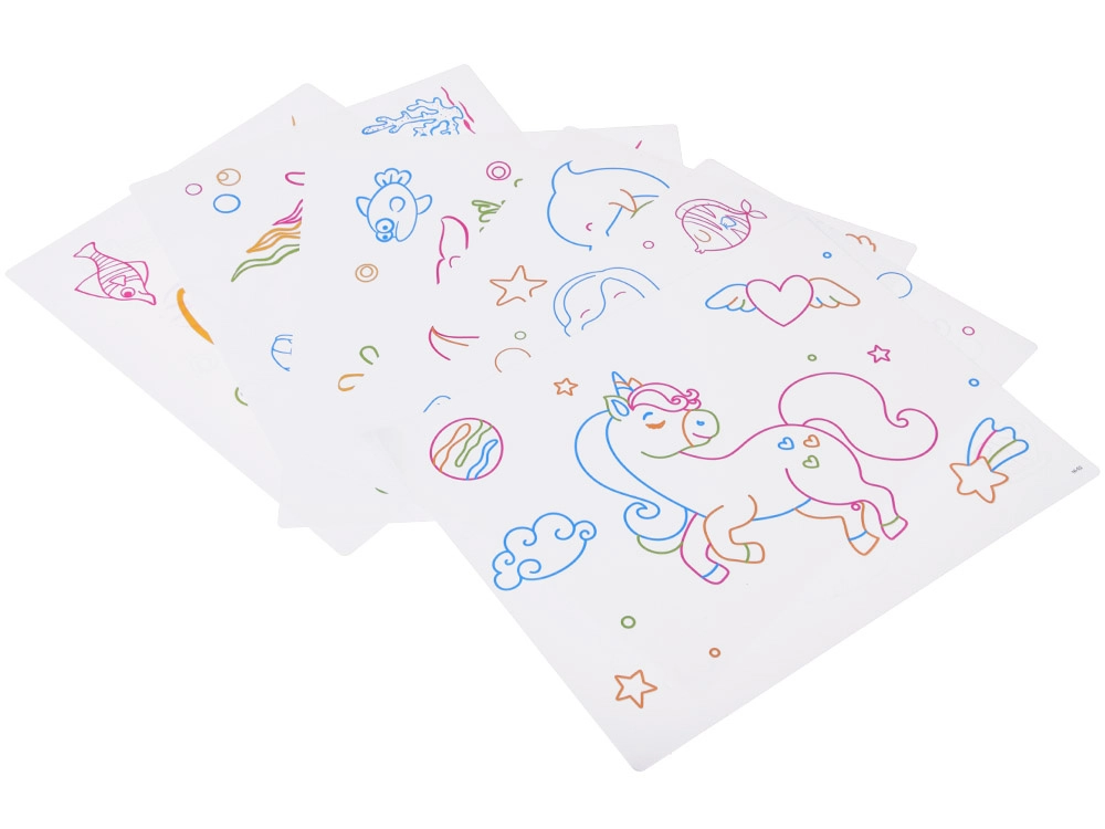 Hladký povrch snadno setřete přiloženým hadříkem a můžete kreslit znovu. Oboustranné šablony s motivy moře pomohou dětem začít a trénovat jistotu ruky.