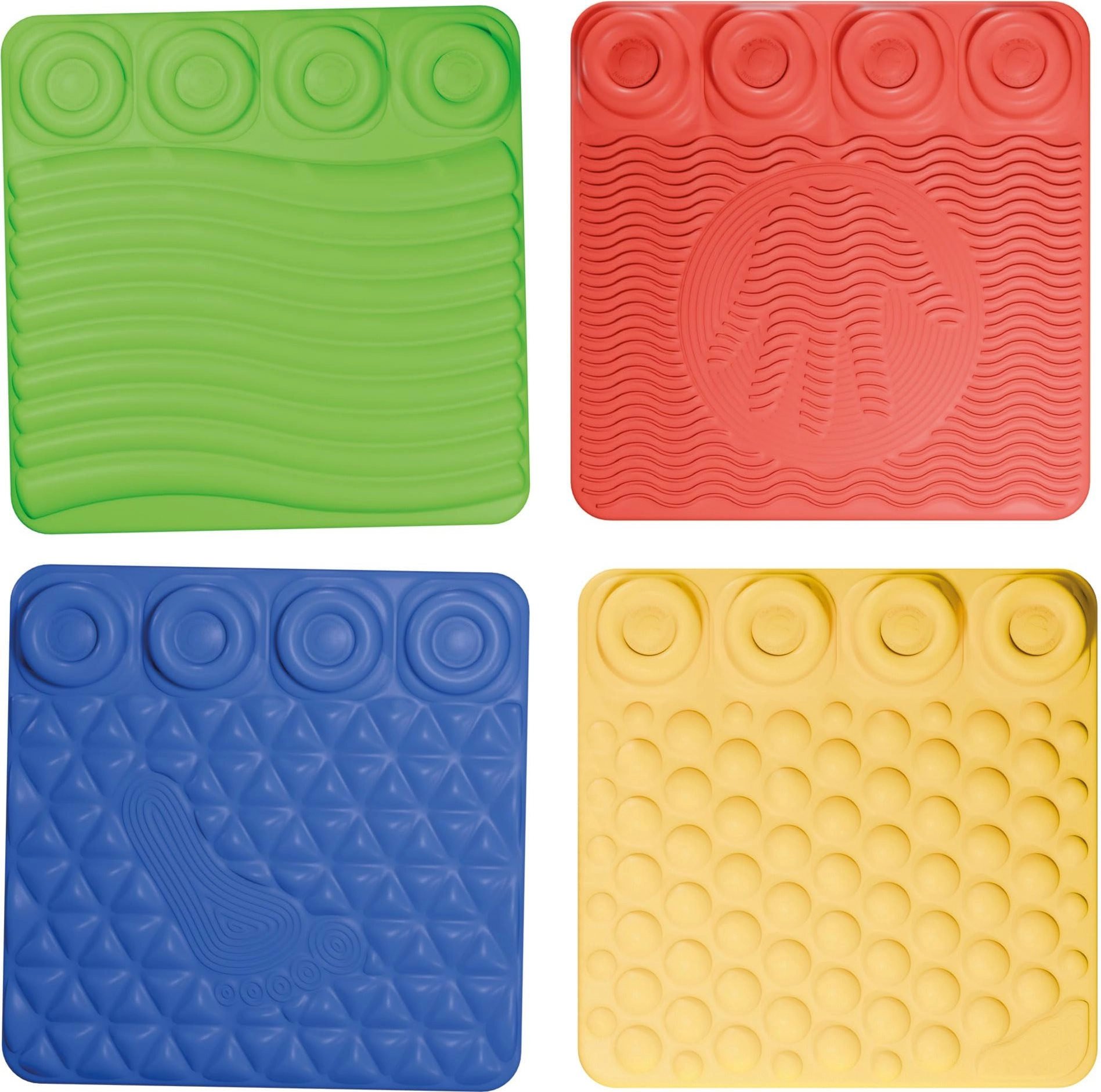 Každá podložka má unikátní reliéf (vlnky, tečky, tvary a stopy), který jemně masíruje chodidla a dlaně a posiluje smyslové vnímání a rovnováhu.