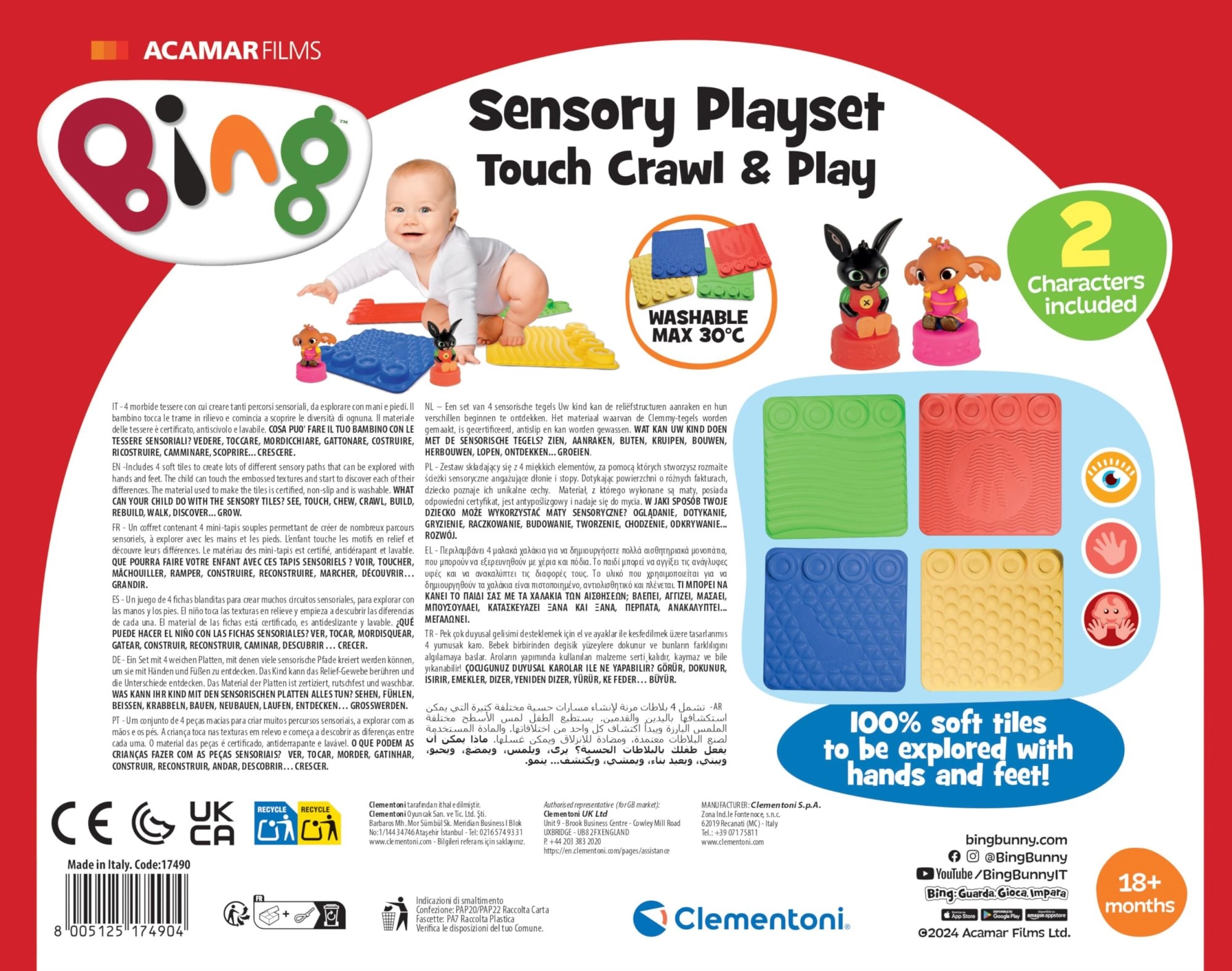Podložky jsou z měkkého plastu, příjemné na dotek a navržené pro bezpečné neklouzavé hraní. Kompaktní rozměry (cca 29 × 23 cm) umožní snadné použití doma, ve školce i na cestách. Výroba v Itálii od Clementoni je zárukou kvality a bezpečnosti.
