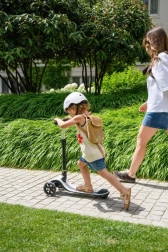 Dvě přední a jedno zadní kolečko zajišťují výbornou stabilitu a snadné držení rovnováhy. Protiskluzová nášlapná plocha a měkké gripy podporují jistotu při každé jízdě.