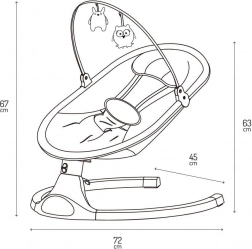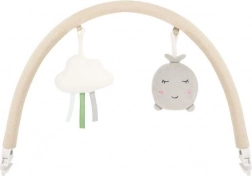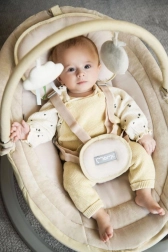 Pětibodové pásy, měkký polštářek a protiskluzové podložky drží miminko v bezpečí a pohodlí. Hrazdička se dvěma hračkami podporuje smyslový rozvoj.