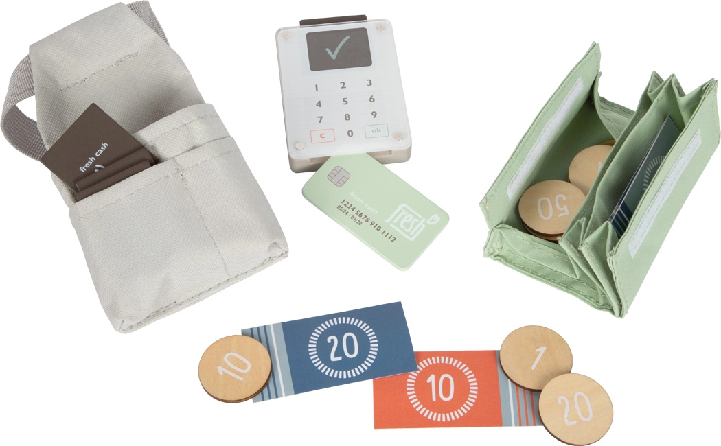 Kapsa na opasek s peněženkou, hracími penězi a čtečkou karet umožní dětem přijímat “platby”, vydávat účtenky a trénovat sociální dovednosti.