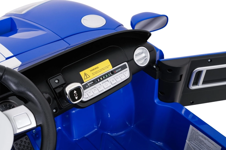 Stylové dětské elektrické autíčko FORD GT v modré barvě nabízí výkonný pohon 4x100 W, baterii 24 V 7 Ah, dvě sedadla z eko kůže s pásy a měkká EVA kola pro pohodlnou jízdu. Rodiče ocení dálkové ovládání 2,4 GHz se spínačem nouzového zastavení, děti pak LED světla, FM rádio, MP3, Bluetooth a USB na palubním panelu.