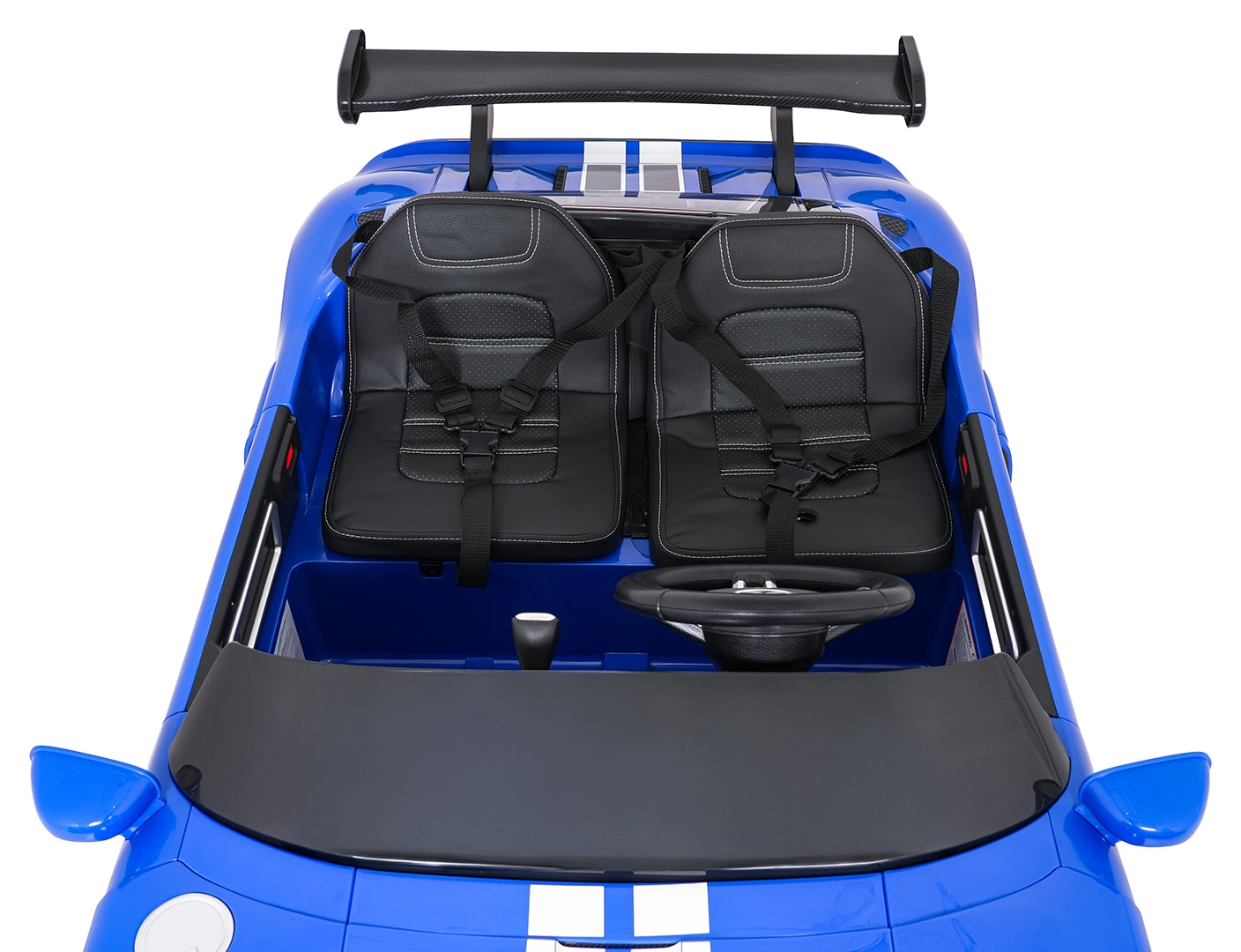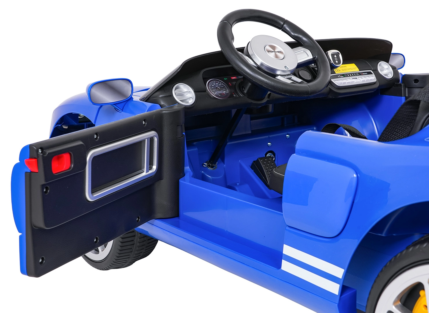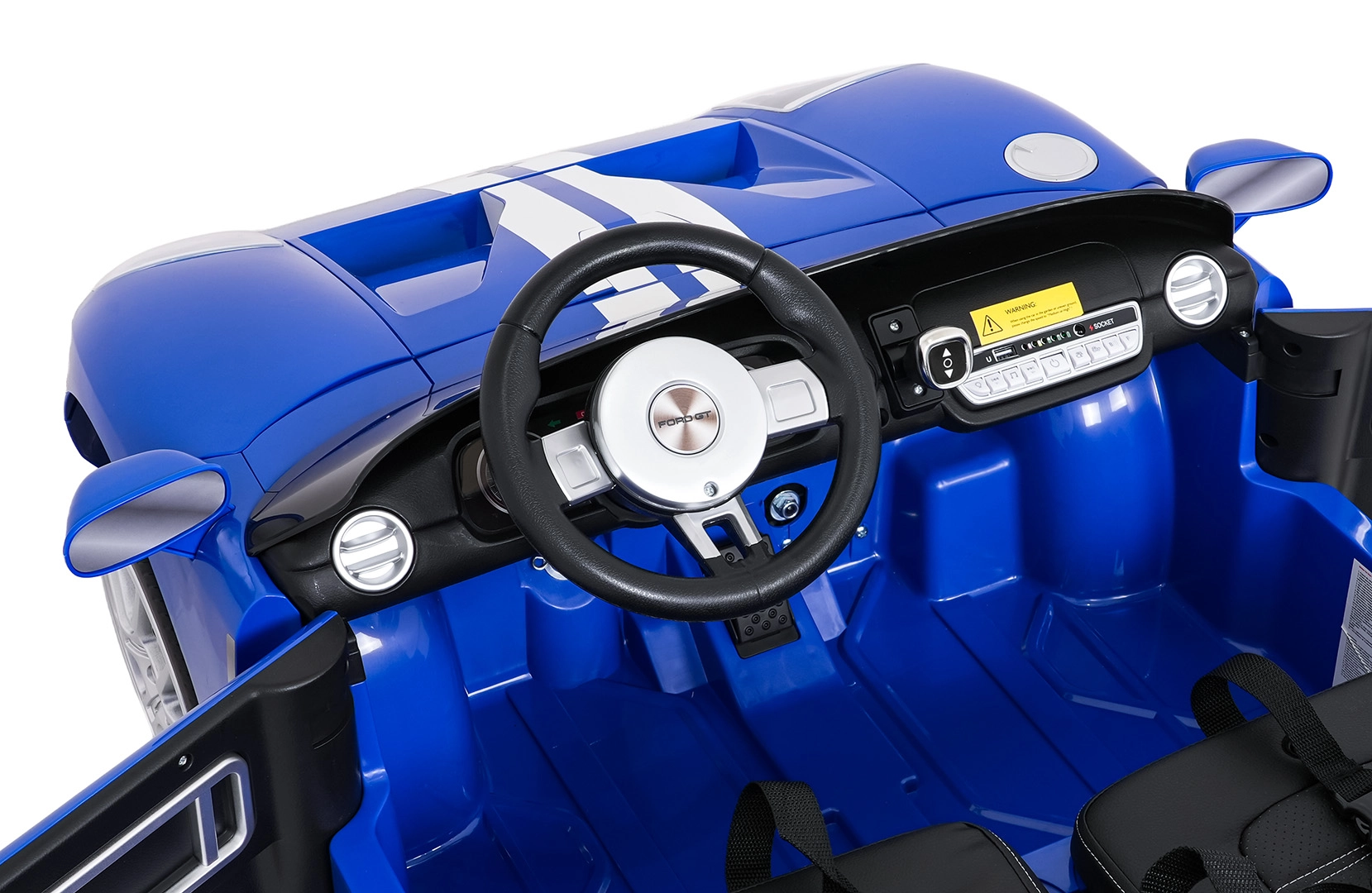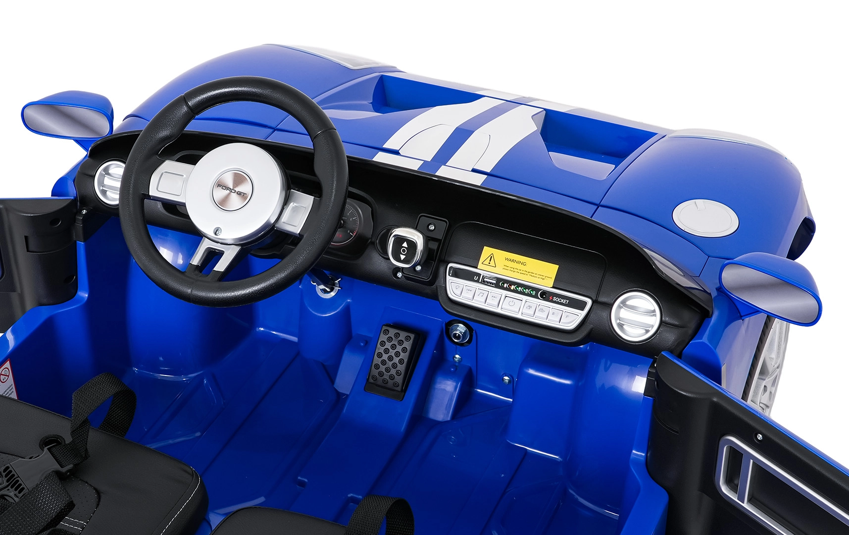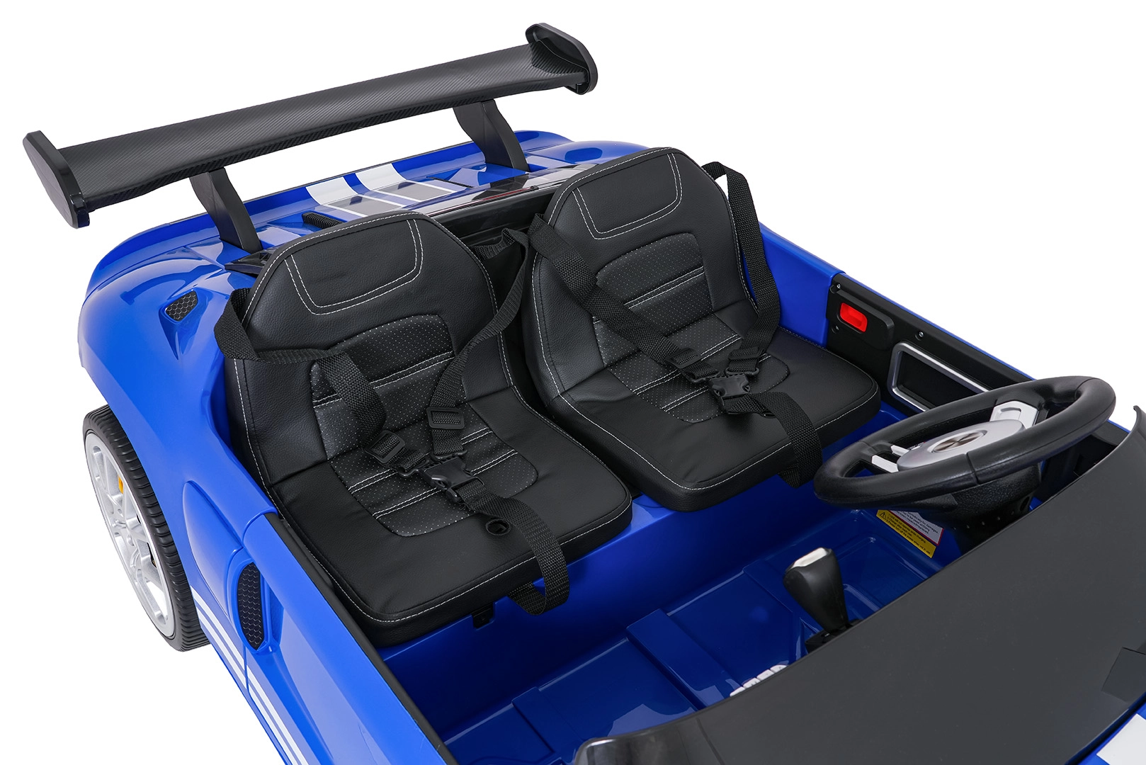 Interiér potěší dvěma samostatnými sedadly z eko kůže s bezpečnostními pásy, funkčním audio panelem (FM, MP3, Bluetooth, USB) a přehledným ukazatelem nabití. Samozřejmostí jsou přední LED světla a přepínač světel. Rodičovské dálkové ovládání 2,4 GHz se třemi rychlostmi a bezpečnostním tlačítkem Stop přináší maximální kontrolu v každé situaci.