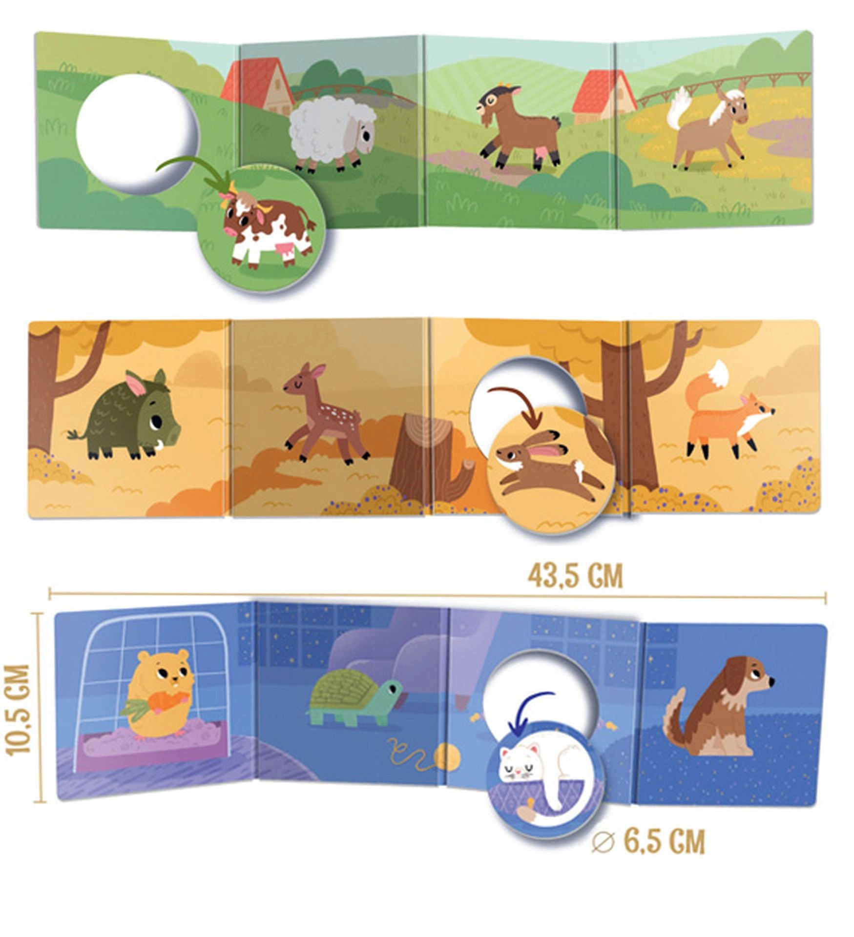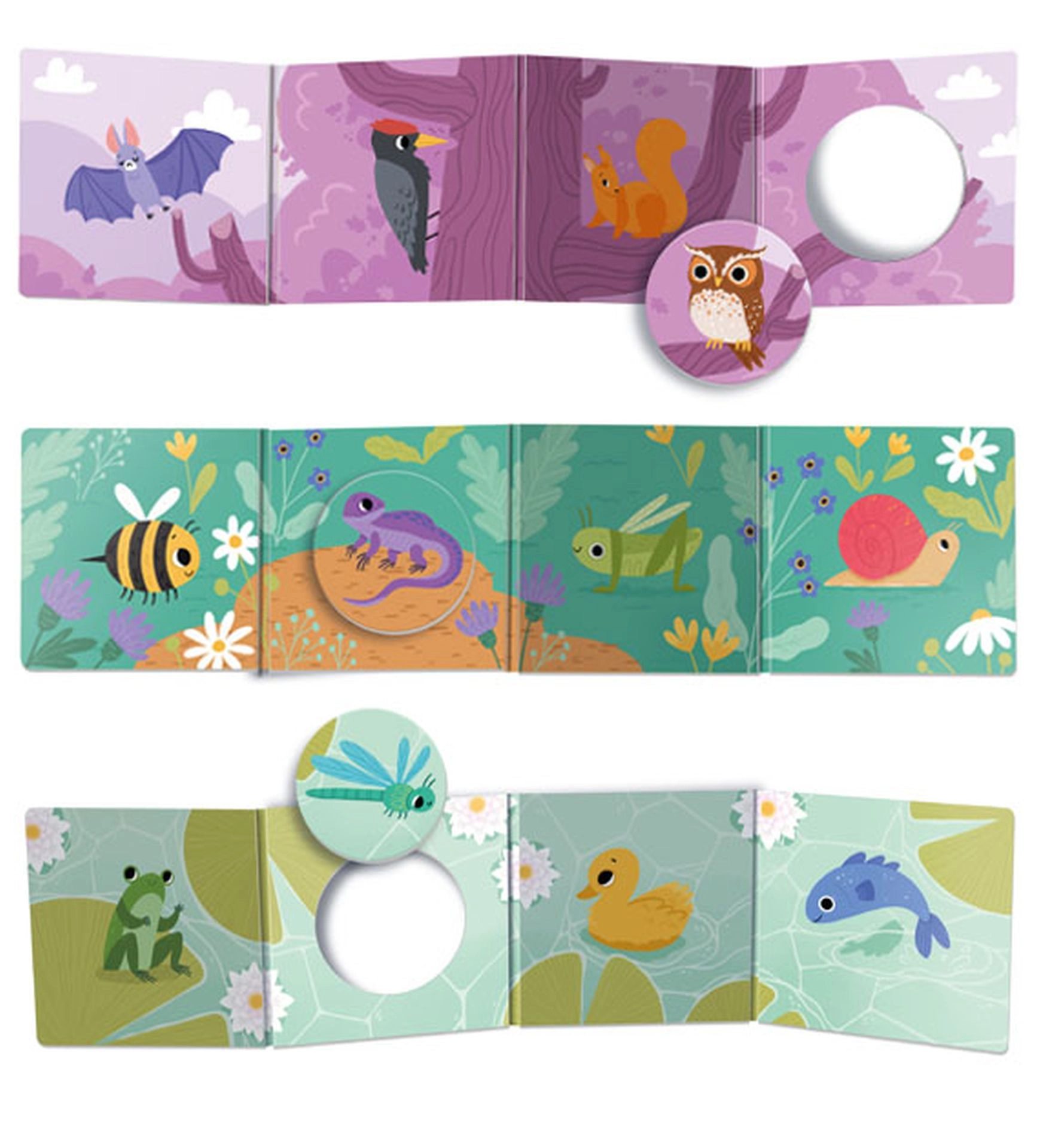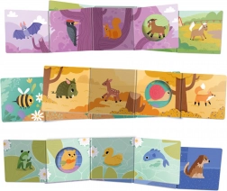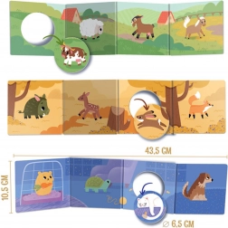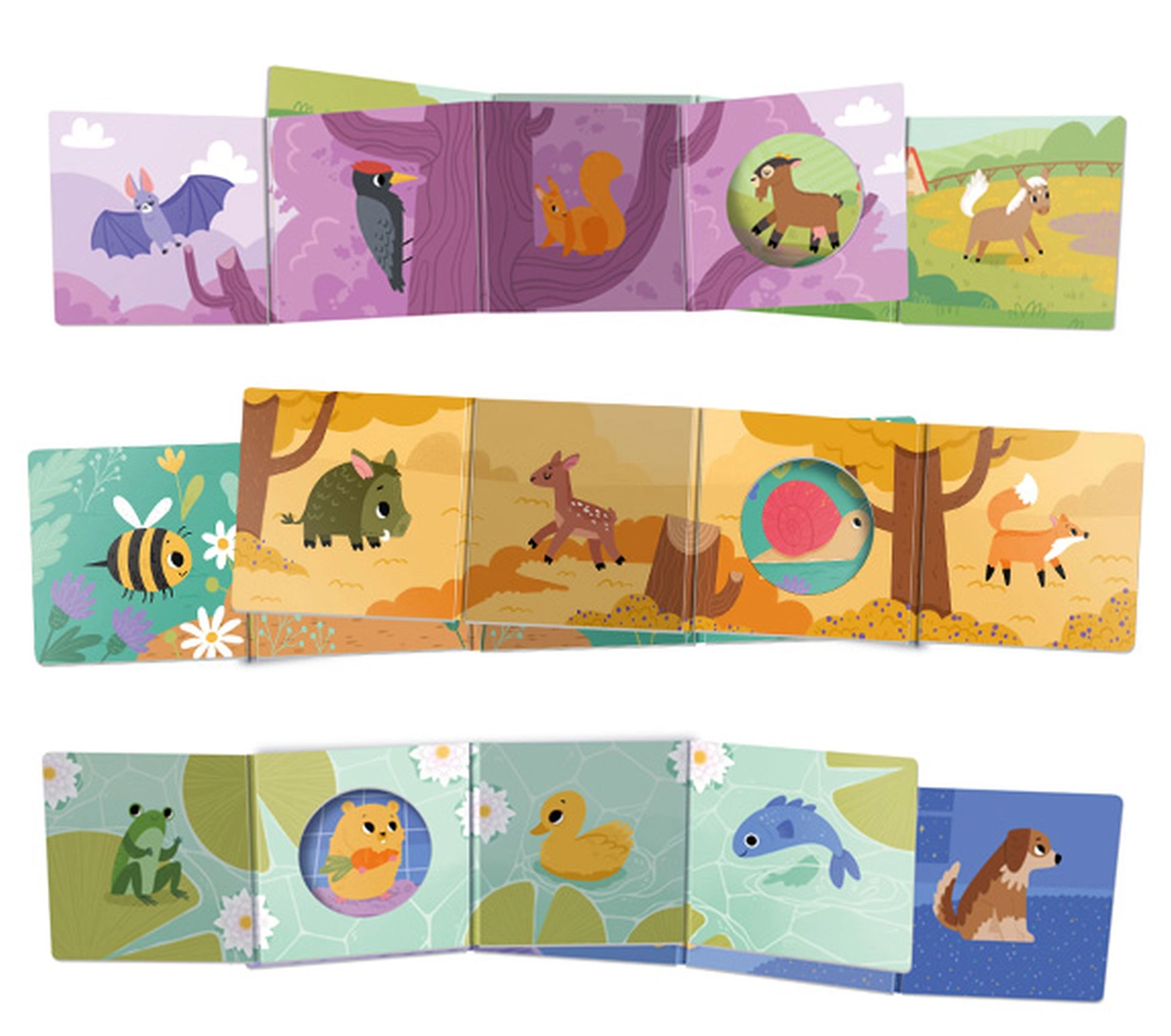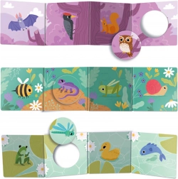 Sada tří oboustranných leporel představuje šest různých prostředí (např. louka, les, pastvina, voda či domov), ve kterých děti objeví celkem 24 zvířátek. Díky kruhovým okénkům a vkládacím žetonům si děti procvičí přiřazování zvířat k jejich prostředí a vytváření vlastních příběhů. Leporela jsou z extra pevného kartonu (2 mm) a mají rozměr 43,5 × 10,5 cm, takže se dobře drží i malým dětem.
