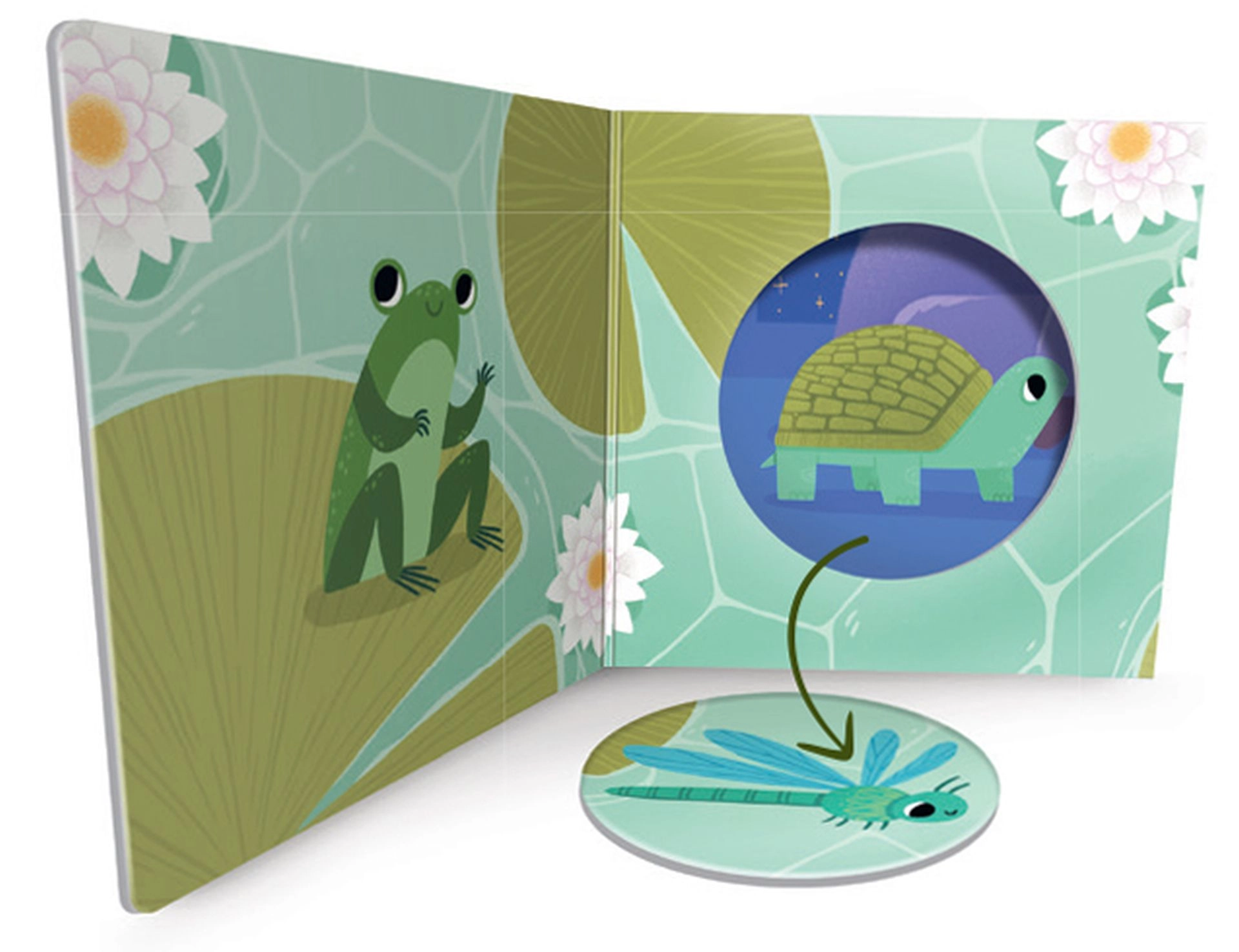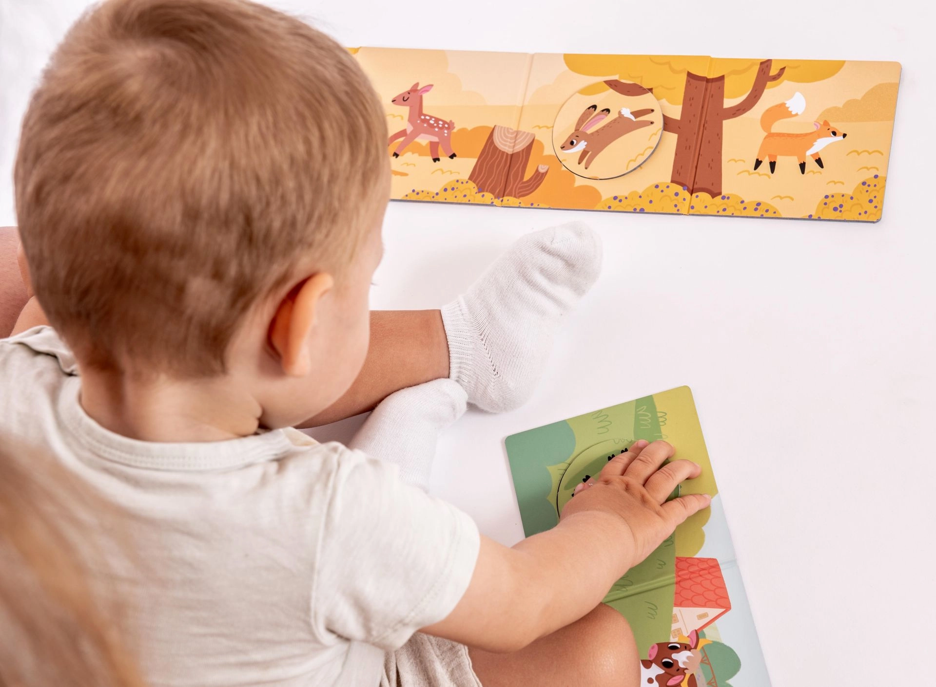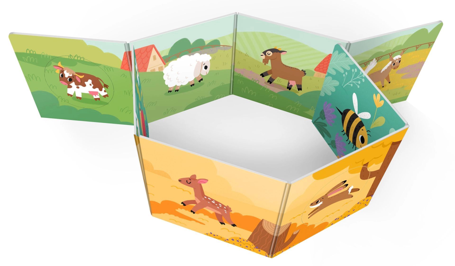 Sada tří oboustranných leporel představuje šest různých prostředí (např. louka, les, pastvina, voda či domov), ve kterých děti objeví celkem 24 zvířátek. Díky kruhovým okénkům a vkládacím žetonům si děti procvičí přiřazování zvířat k jejich prostředí a vytváření vlastních příběhů. Leporela jsou z extra pevného kartonu (2 mm) a mají rozměr 43,5 × 10,5 cm, takže se dobře drží i malým dětem.