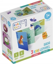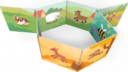 Sada obsahuje tři oboustranné leporela se scénami z lesa, vody, louky, farmy a dalších prostředí. Pevné stránky z 2 mm kartonu vydrží dětské zacházení.