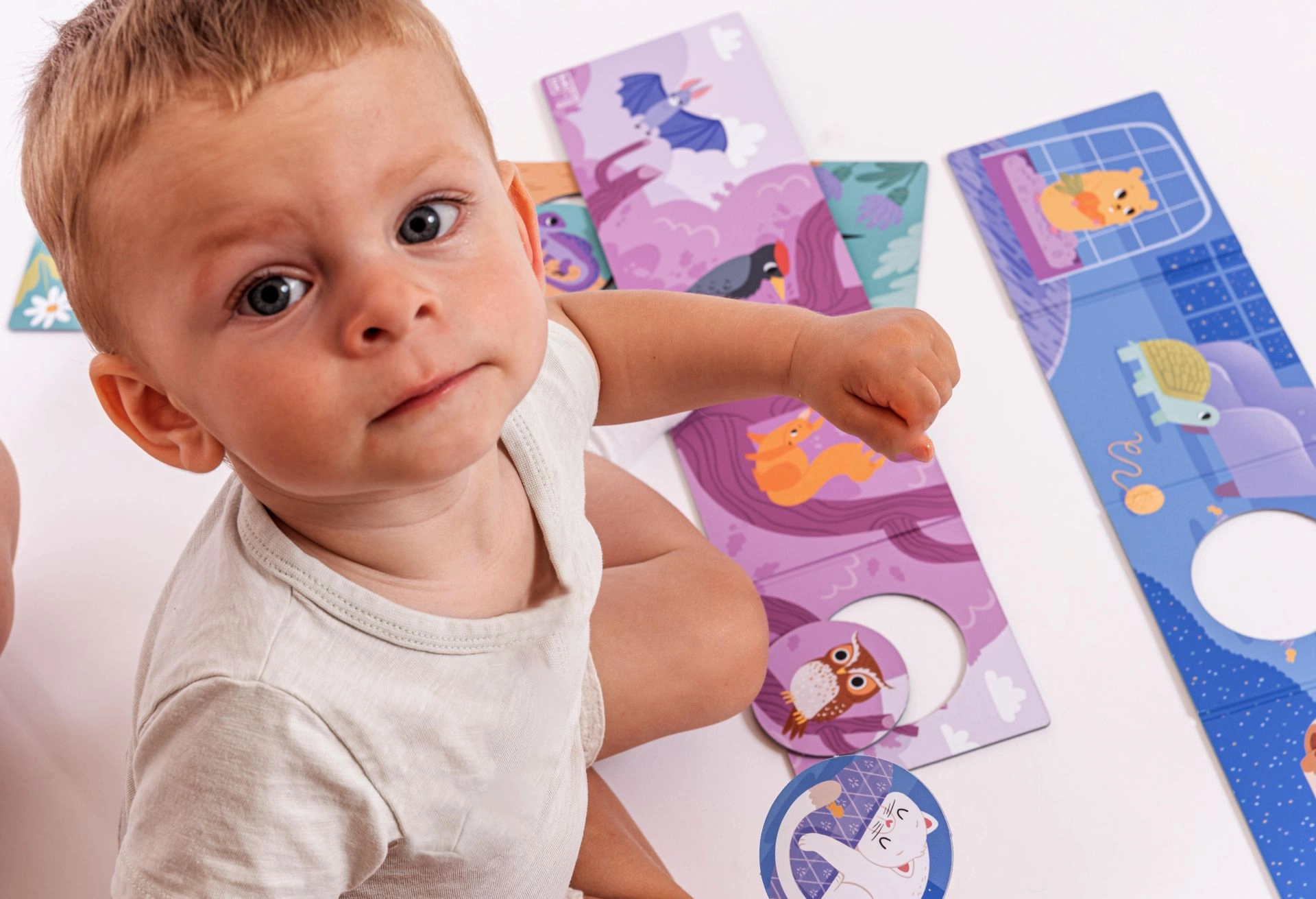 Kruhové výřezy a kulaté žetony se zvířaty vybízejí k přiřazování a objevování překvapivých „kuk“ momentů. Děti zábavně trénují logiku i fantazii.
