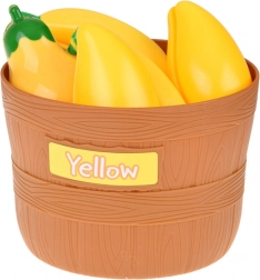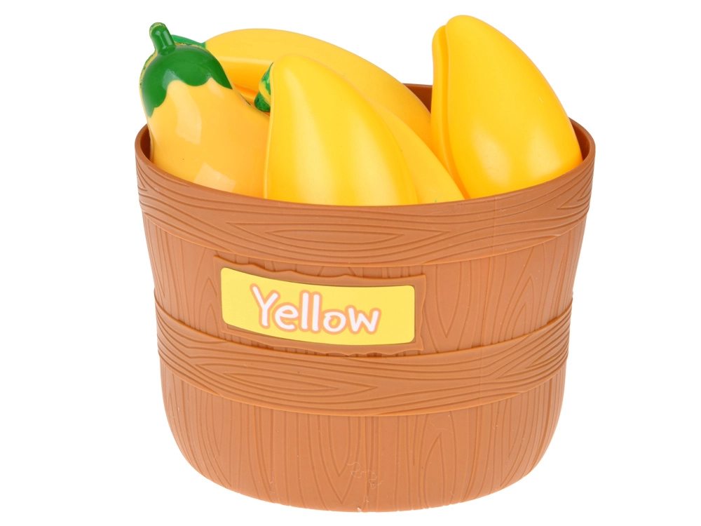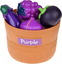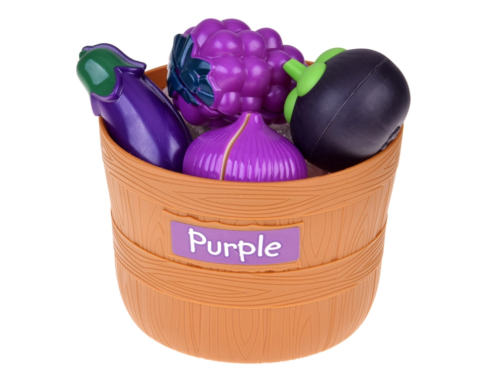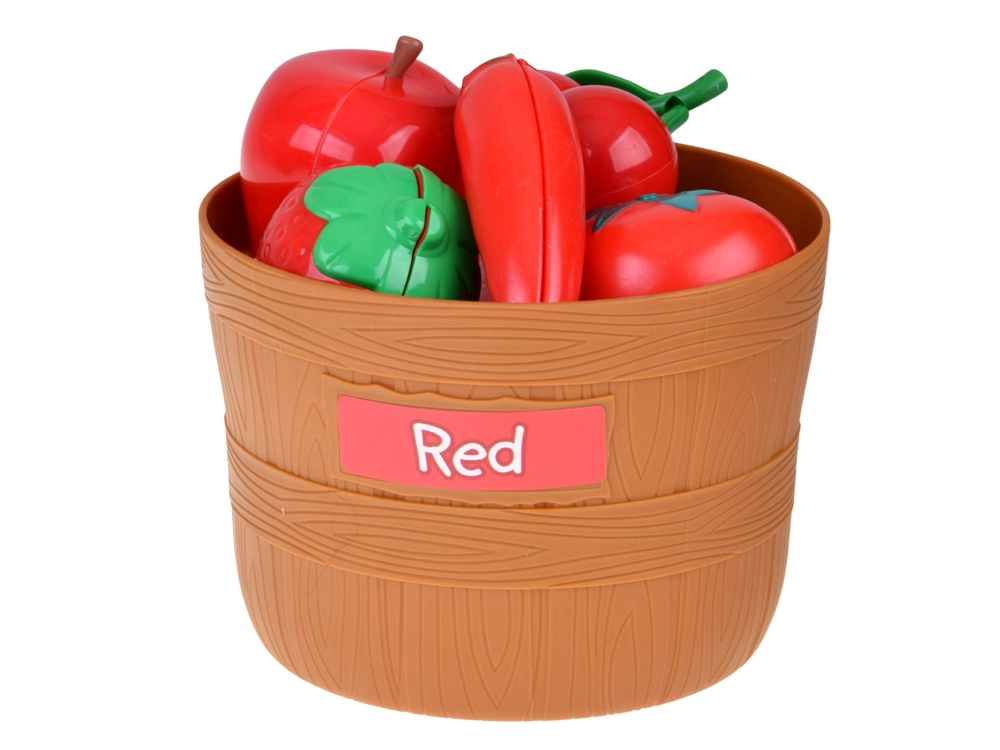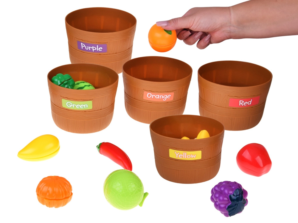 Pět košíků s barevnými štítky motivuje děti třídit potraviny podle barvy. Skvělý základ pro rané vnímání a rozvoj logiky.