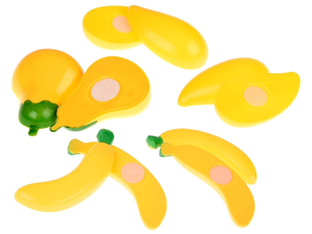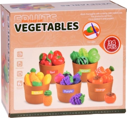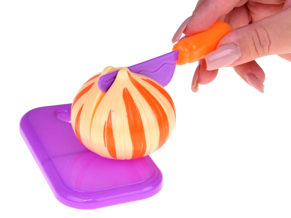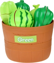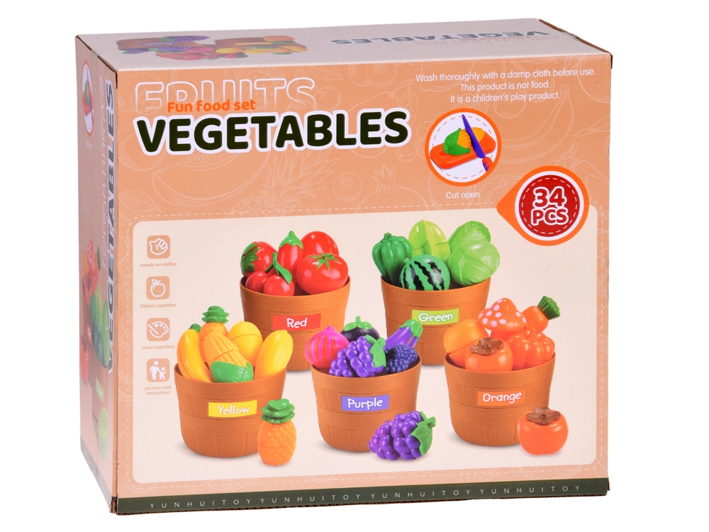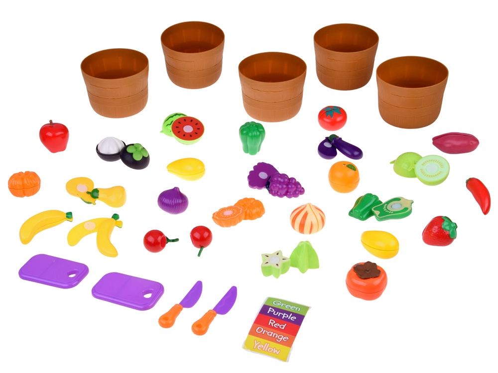 Součástí jsou odolné košíky s barevnými štítky, dvě prkénka a dva bezpečné nože pro nácvik správného úchopu a koordinace oko–ruka. Hra rozvíjí jemnou motoriku, logické myšlení, slovní zásobu i kreativitu.