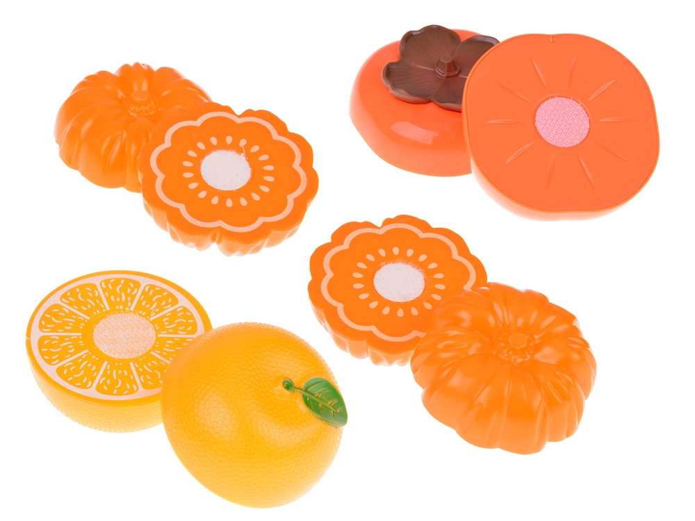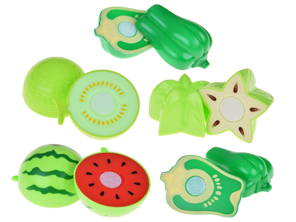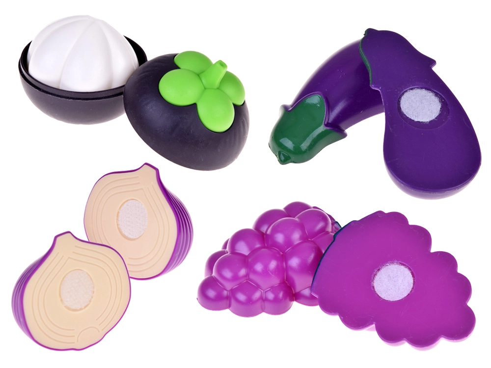 Tento velký set dětského plastového jídla spojuje zábavu a učení. Děti mohou „krájet“ kousky na poloviny a opět je spojit díky suchému zipu, třídit je podle barvy do košíků a hravou formou se učit názvy ovoce a zeleniny. Realistické tvary a výrazné barvy lákají k objevování a k pretend play v dětské kuchyňce.